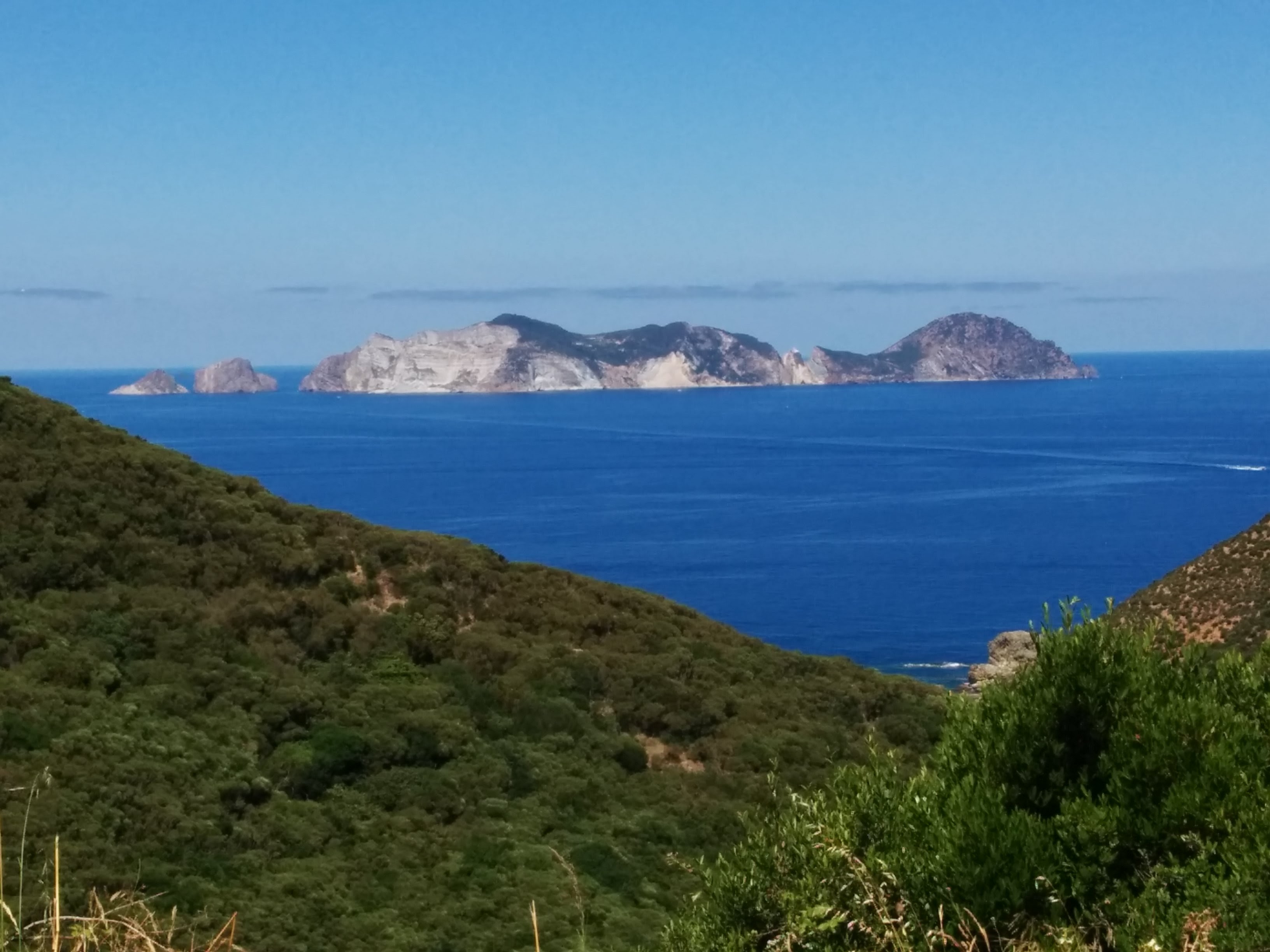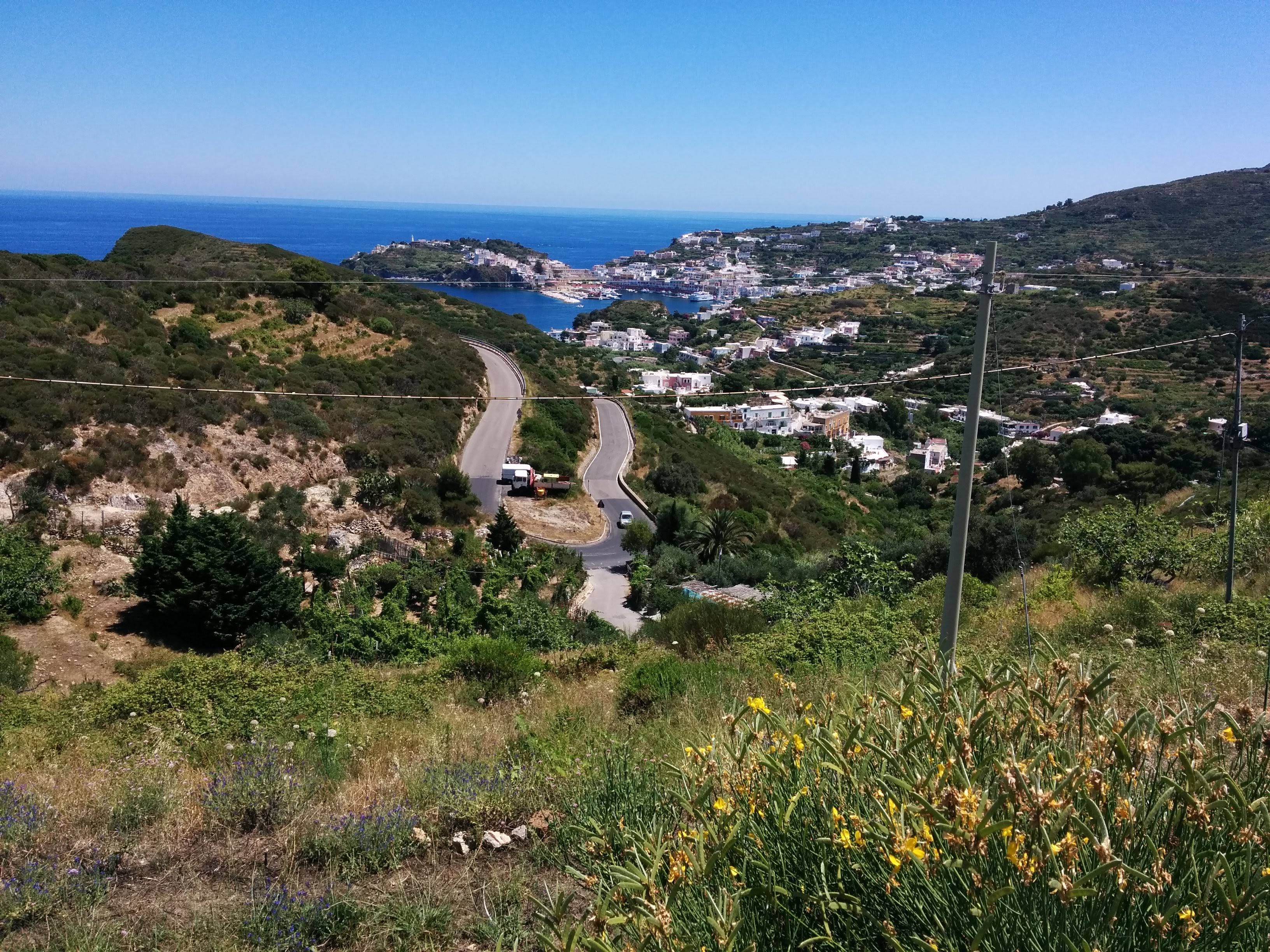 The next day (Sunday), we mounted our bicycles and rode a giro di Ponza. The whole island is only 20 km long. The roads were well paved. Visibility was good, and we found that the only really steep climb was getting out of town. We rode as far as we could to the North, parked the bikes, and hiked into the Punta Incenso Natural Park. Lots of sharp underbrush, and no markings on the almost invisible trails. We navigated by keeping track of where the top of the park was (almost 200 m high). Riding back towards Ponza, we looped around the south end of the town.