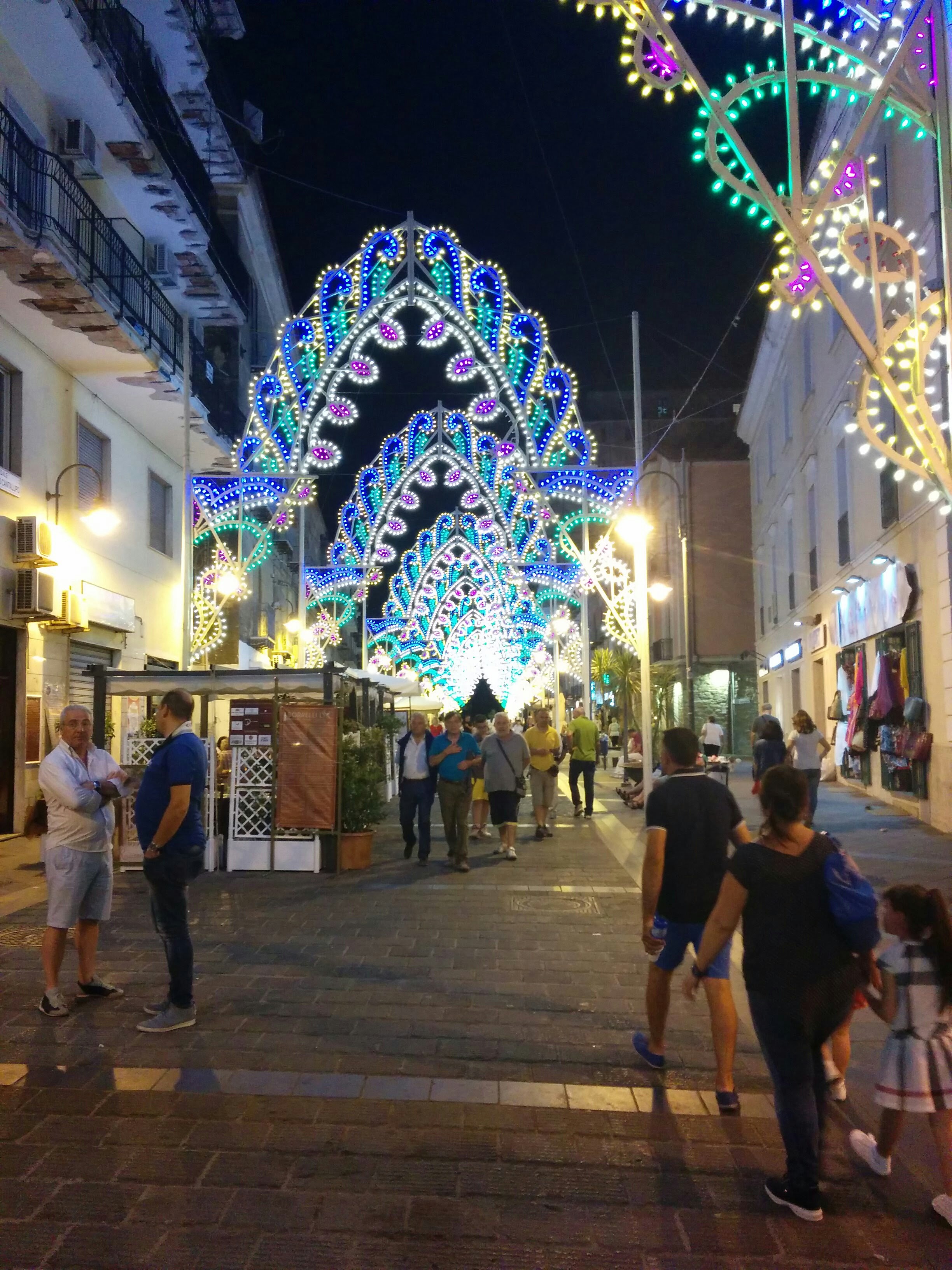 Paestum lay only 16 km from the ancient Greek city of Agropoli, an easy ride through the farmland. We reached the town in plenty of time to enjoy the festive atmosphere. The parish festival had been the day before, but the decorations were still up, and happy crowds filled the streets. Agropoli features a massive Aragonese castle on the top of the hill and a small, but accessible medieval historic center.