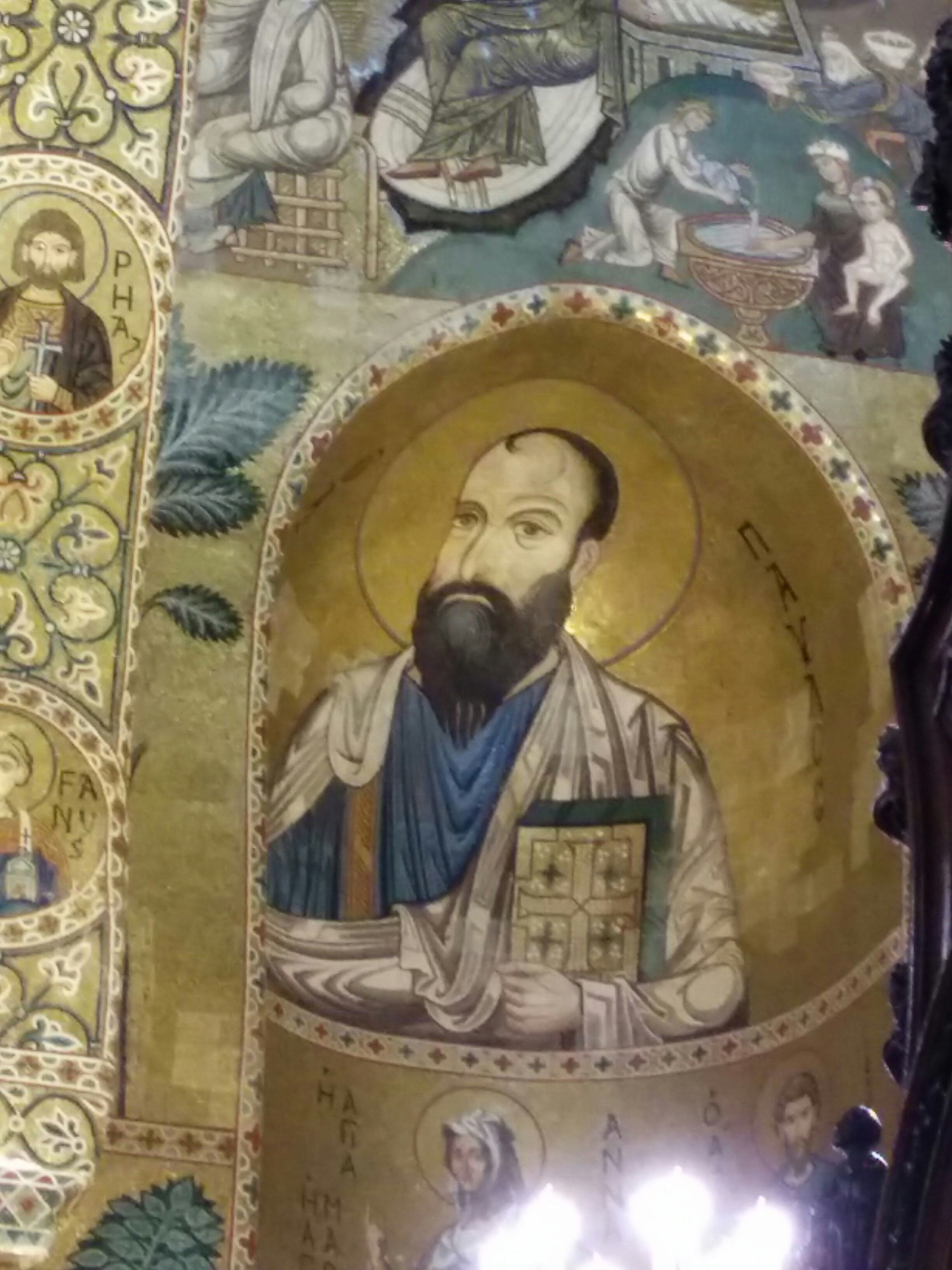 Let someone else do the driving, and don’t bother biking up the hills. Cheryl told me that the mosaics in Palermo were just a warm-up for Monreale. She was right. The mosaics in the Cathedral easily surpassed any Byzantine-style mosaics that I had ever seen (I have not visited Ravenna, but that is another story). These mosaics consist of polished glass, rather than stones. Monreale displays a different type of mosaic from the painting-like pictures of the Vatican Mosaic Factory, and both places stand at the top of their respective genres.