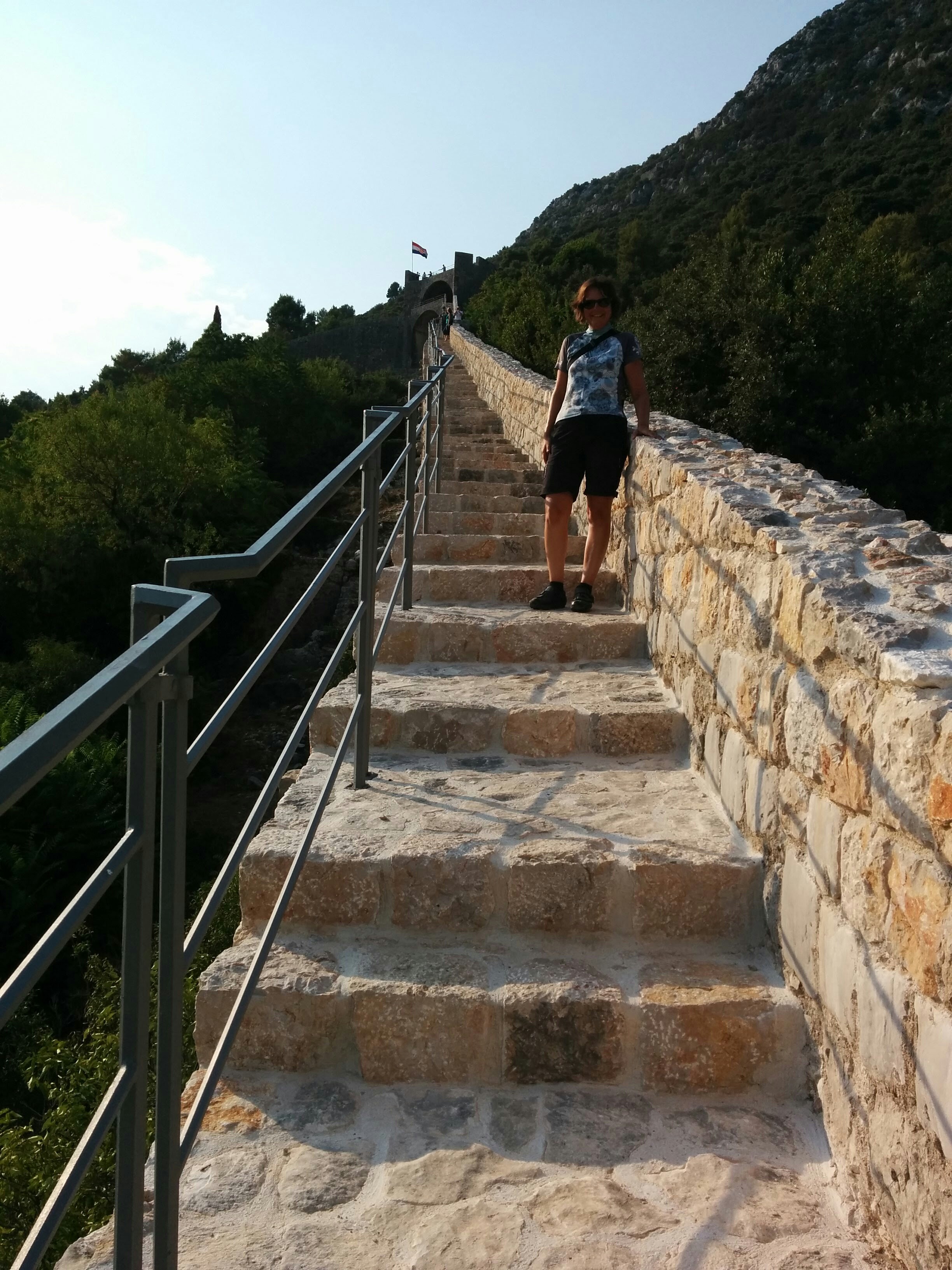 Using a UNESCO grant among other resources, the Croatians are restoring the wall, which not only circles the city, but carries around the mountain to Mali Ston, the port almost two kilometers away. One can walk the inner part today, and periodically the whole thing is opened up for special events, like marathons. We walked the wall, which may not have made sense after riding there, but the view justified the exercise.