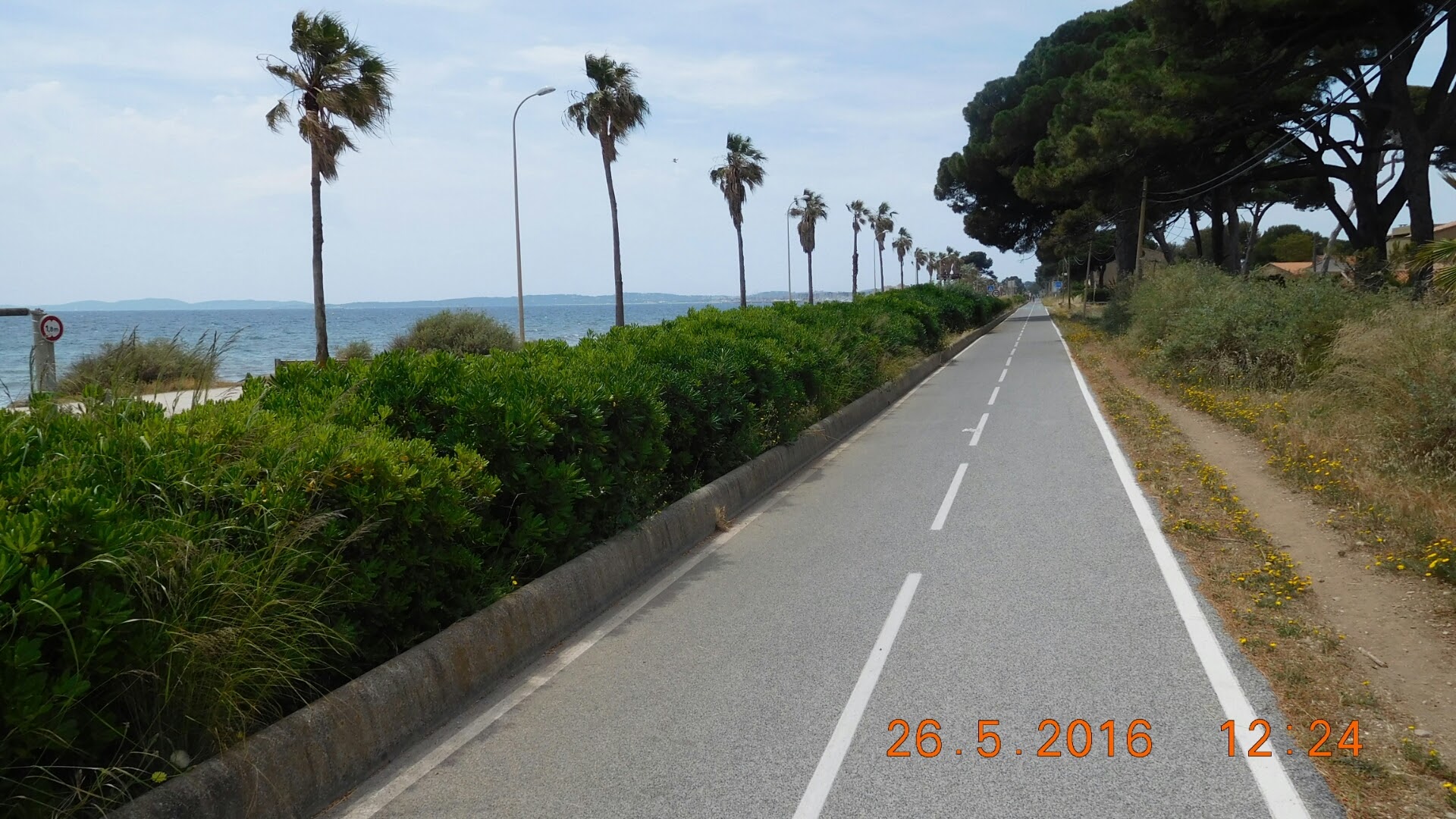 Thursday morning, the humidity was so low (and the sandy site so dry) that I had no moisture on my tent and my laundry had dried overnight. Rather than the sea coast, I enjoyed the Parcours cyclable du Littoral, more than 60 km of separate, paved bike path following D98 and D559 from St. Maxime to Toulon. I rode 71 km, and spent less than ten of it on roadway. The path was closer to the coast than the highway, but this was not the scenic part of the Riviera. This was where the salt flats around Hyères and Toulon began. I remember the working salt flats from the mid-1970s. They were like the salt flats at Ston in Croatia (see the post of 19 December 2015), except that they had large piles of collected salt stashed around them here and there. This week, it looked like marshland, as if no one were farming the salt anymore.