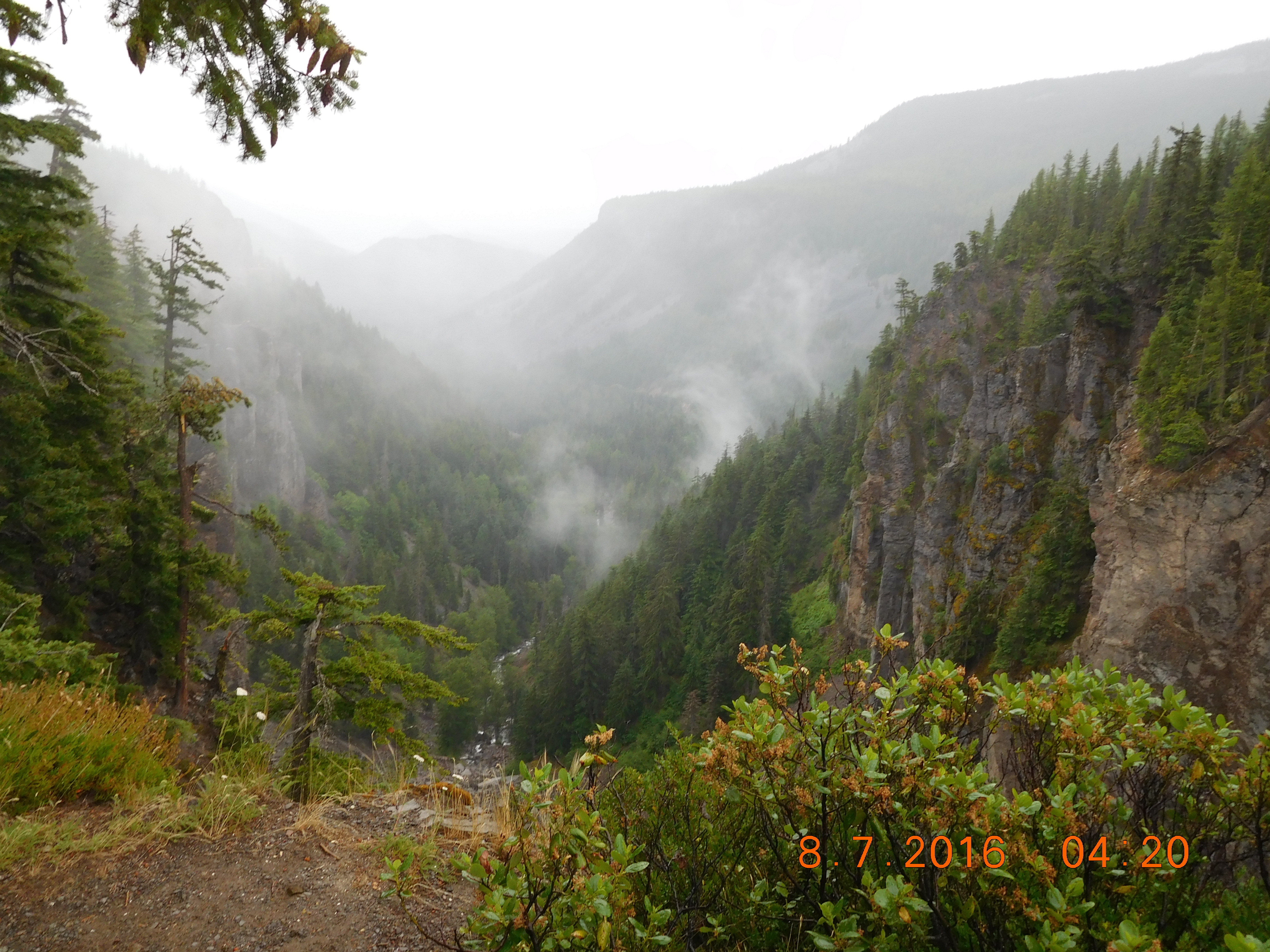 The next morning, we continued down the Columbia Basin to Seulah and Yakima. This area is high and dry: even the valleys are at 1100 to 2000 feet (610 m). We turned west to climb Mount Ranier, and the weather began to sock in. The mercury fell as we climbed the active volcano that dominates central Washington.