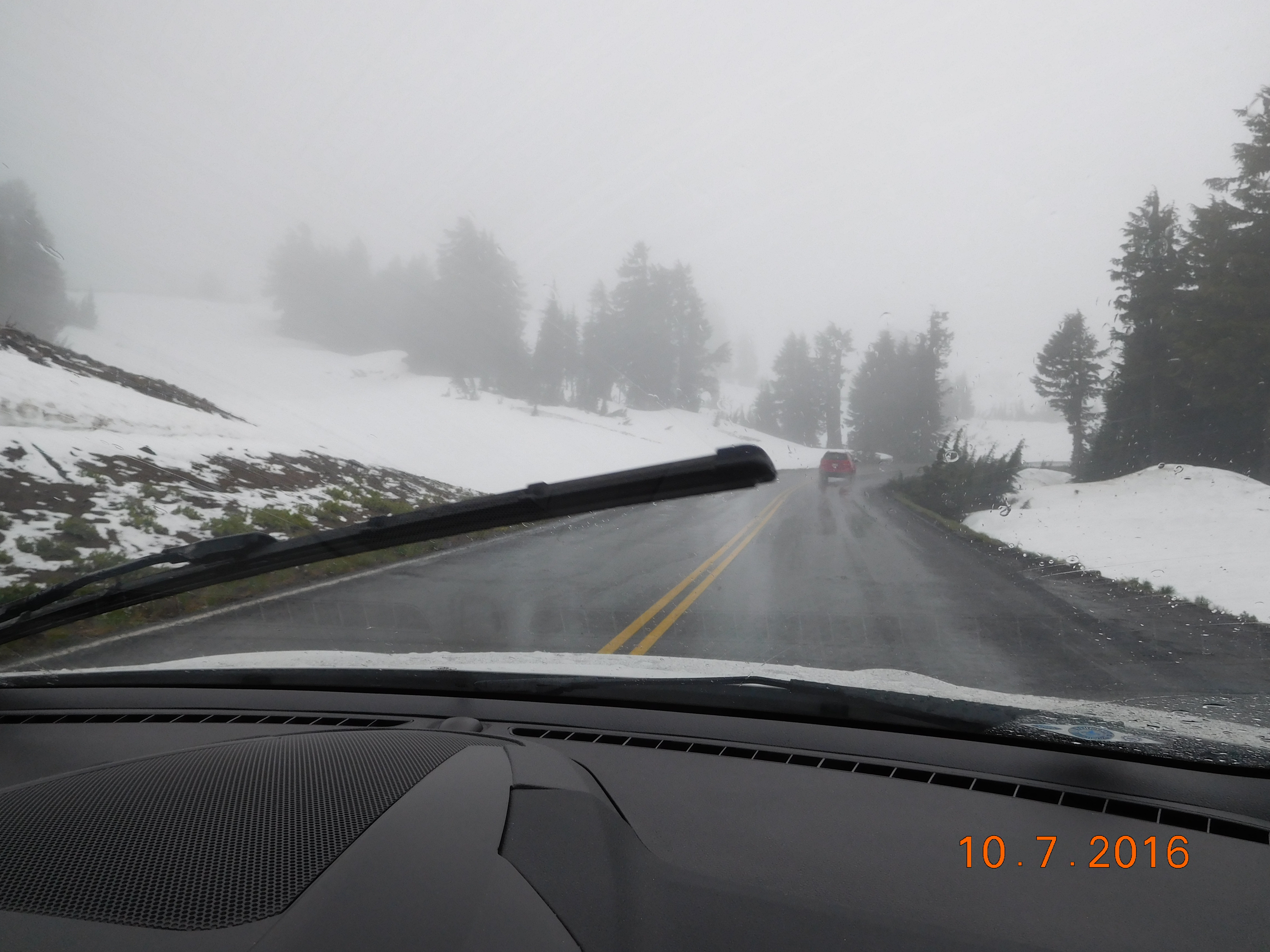 There was a Summer Festival in Bend, so on Sunday, we walked among the kiosks, and had lunch at La Magie, before heading down US 97. Just south of Bend, we stopped at the Lava River Cave, and walked the longest uncollapsed lava tube in the world (2 km). The weather was warm and sunny as we continued down US 97, but the climb up Route 138 to the rim of Crater Lake took us into freezing temperatures and fog so thick we could hardly see the next hairpin turn.