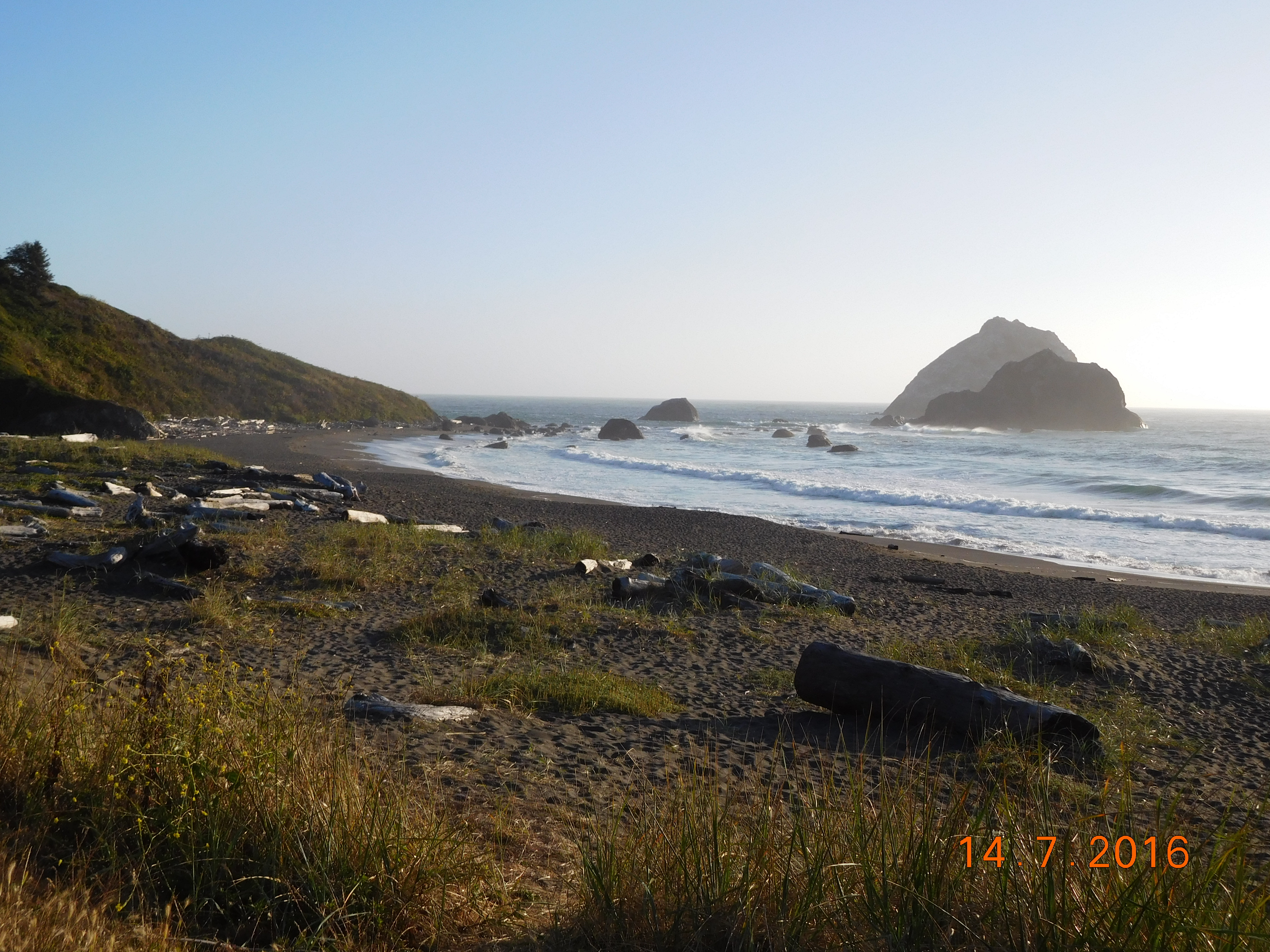 Friday the 15th was our last day. We broke camp early and headed for Jedediah Smith State Park, where the redwoods were just as impressive, but the feel of the forest was different. In this part of the Coastal Redwoods State Park, the trees were spaced apart in cleaner groves, and there were fewer “fire ladders” (Douglas firs that carry flames in the brush up to the canopy and kill the redwoods that could otherwise survive a wildfire).