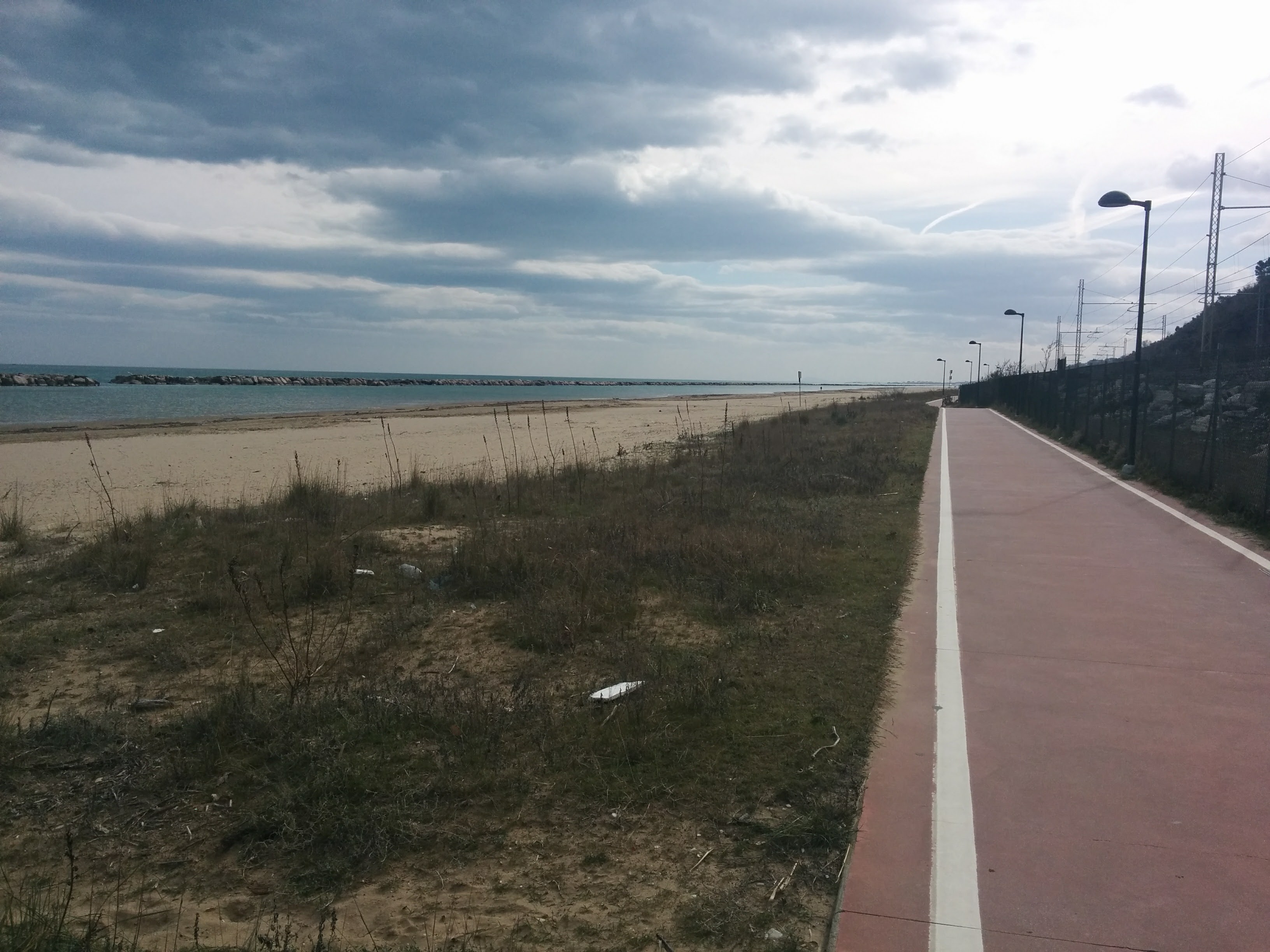 Tuesday morning, I decided not to board the train in Pesaro, but to ride the Ciclovia Adriatica to its end in Fano, only 12.5 km. The bike path was as pleasant and intermittently sandy as I remembered. It took very little time to get to Fano, so I had time to have breakfast at the station bar and try to use the ATM (broken).