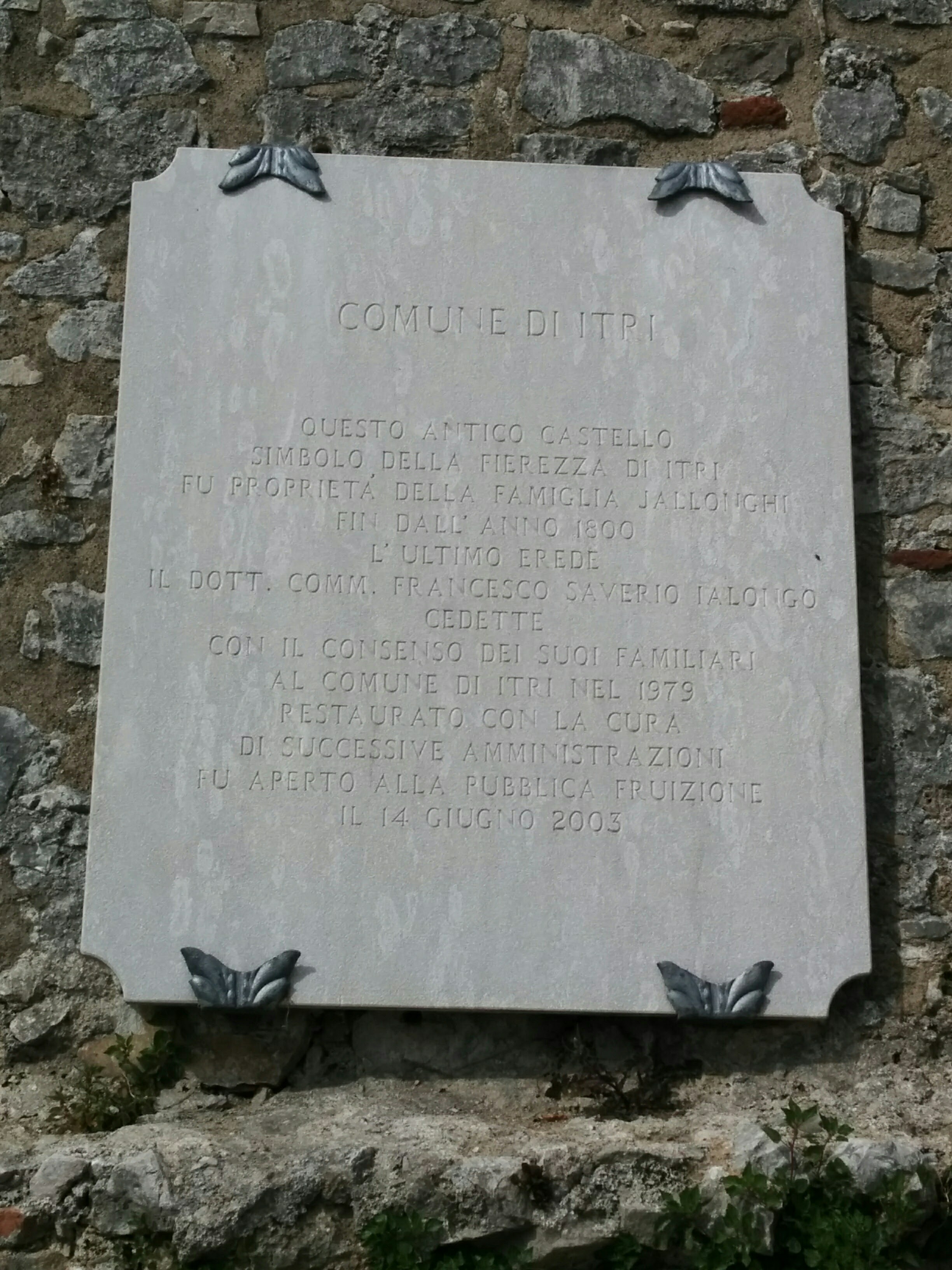 A marble plaque informed me that the castle had been willed to the city of Itri by the last heir of the Jallonghi family, which had owned the place for almost two hundred years. That was in 1979. Successive town administrations had worked on the place, until it was reopened to the public in 2003. The interior was bare, but it had been restored in brick, plaster and masonry to its original shape. The stairs to the battlements were safe. The place was spotless.