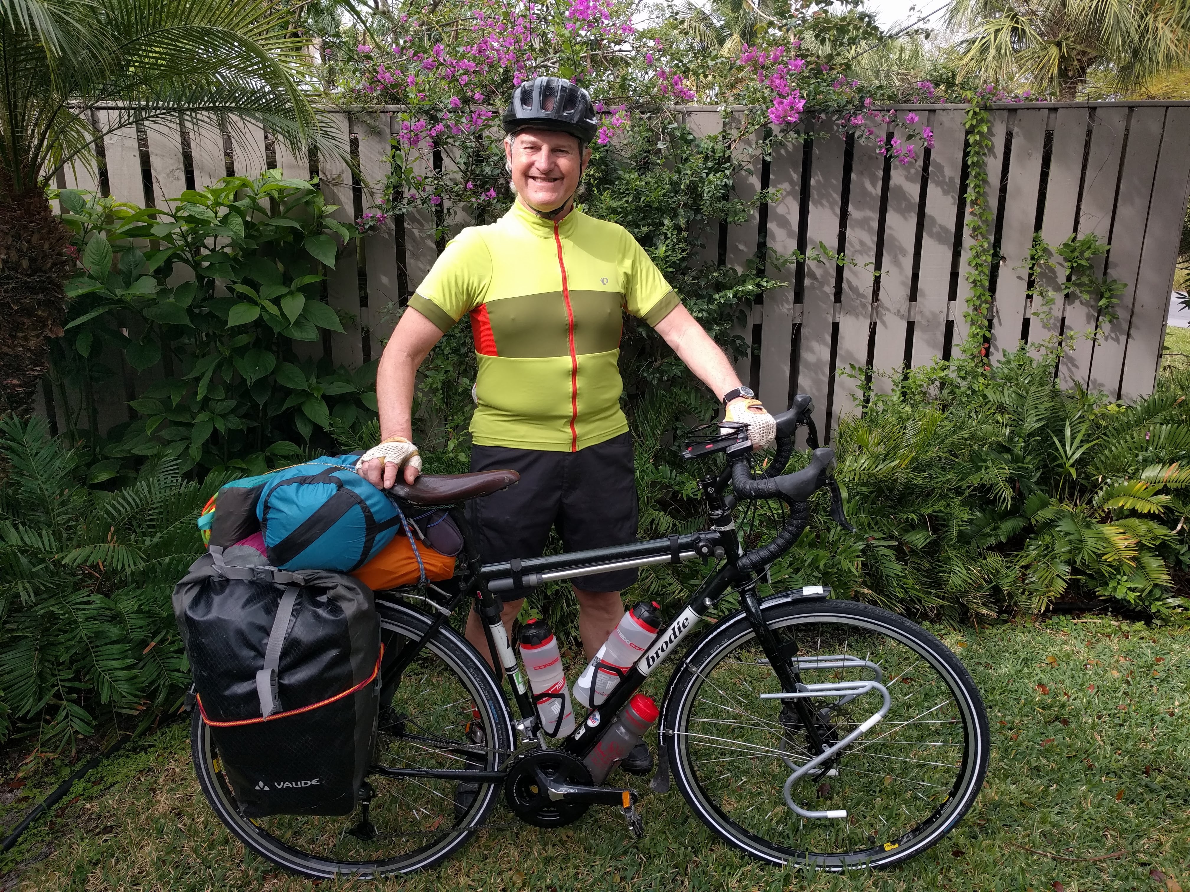 Tuesday, smooth roads and tailwinds blessed me again. A light cloud cover kept the sun from burning, but rain did not threaten. I easily found my way into a tidy neighborhood of Boca Raton, for the first of several WarmShowers stays. Vance and Tommie Wingfield set the bar very high for other hosts. Imagine having the Mercedes parked outside so the bikes could park in the garage! A comfortable room and a pleasant evening at the local pizzeria.
