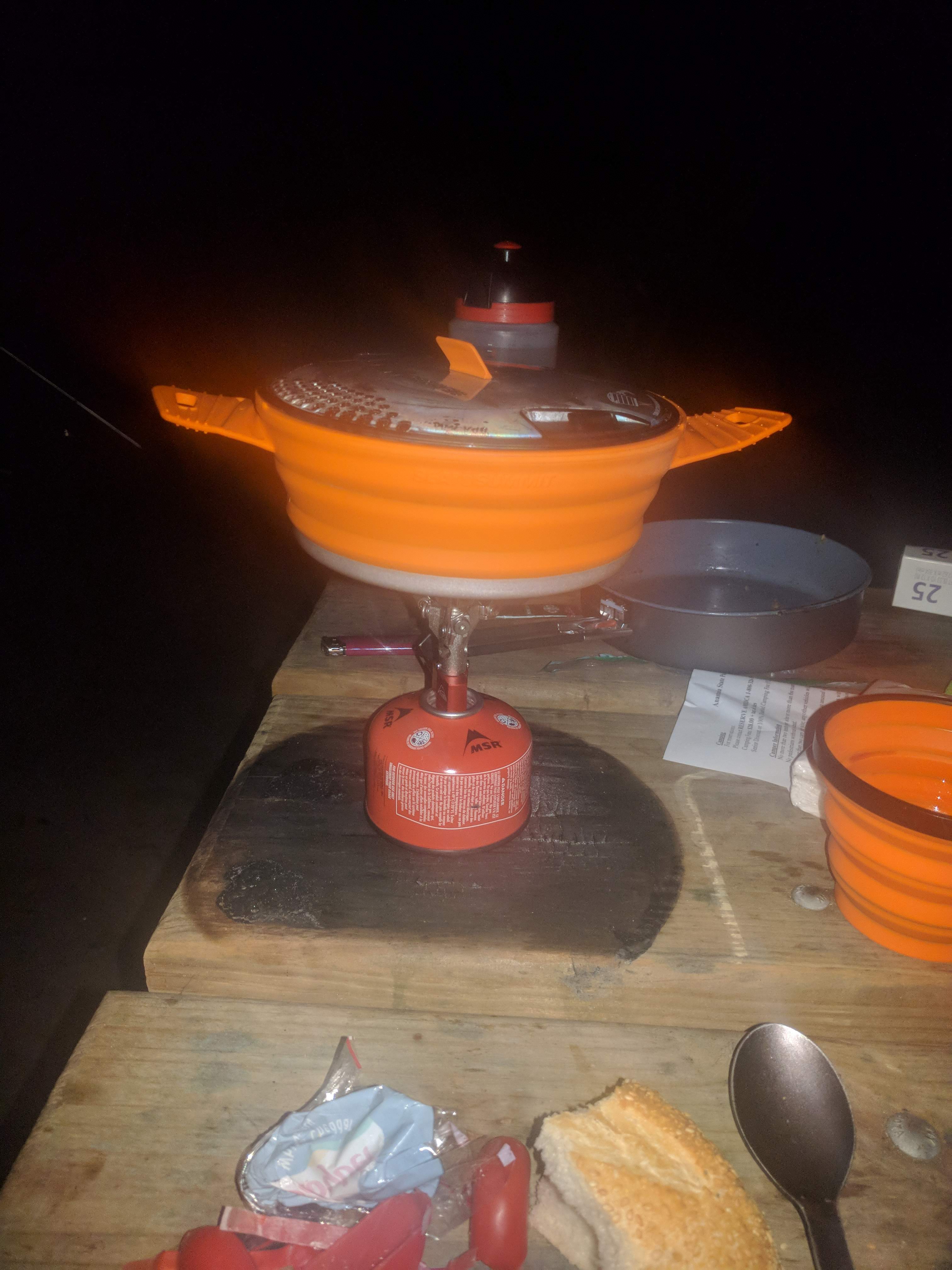 Luck was with me as I pitched my tent in the Jonathan Dickinson State Park across US 1 from the water. As the wind increased, I expected rain, but I was able to cook my supper (tuna on Seeds of Change rice) in the lee of the vending machine building. The rain was limited to some unenthusiastic sputtering, which dried off well before morning.