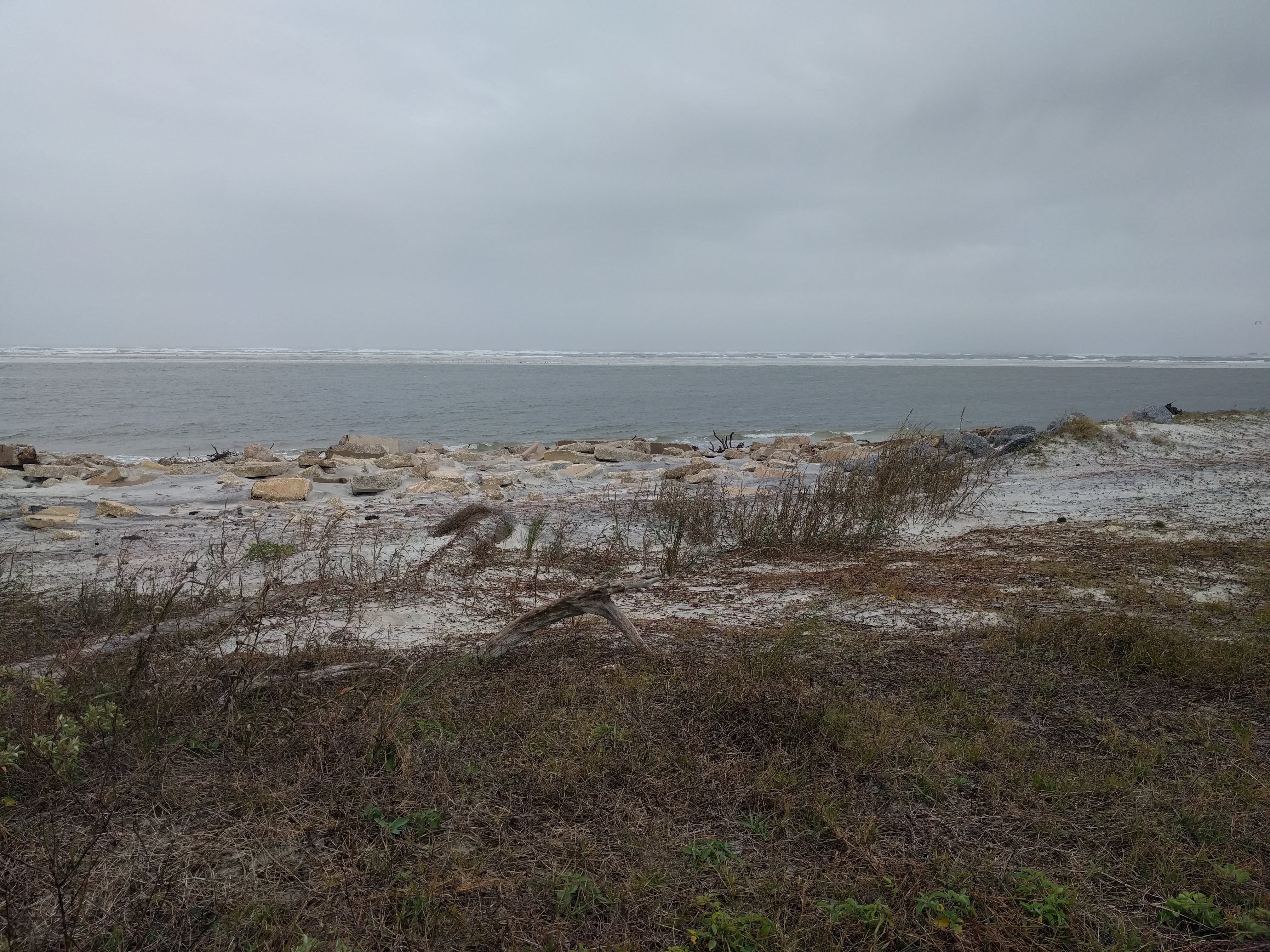 The rest of the rain arrived Thursday morning, just as I got everything packed up and headed back to US 1 from the Pine Grove Campground in the park. I rode the length of Hutchinson Island on a broad reach with an easterly crosswind. Water dribbled off my Arc’teryx jacket, but it was warm, so I did not mind. There wasn’t much to see, because the private homes behind walls blocked the ocean and the waterway from view. I had not expected much scenery; I felt almost elated to come across small natural areas with nothing on them but sand dunes and sea grass. I had chosen this route to see the sea, after all.