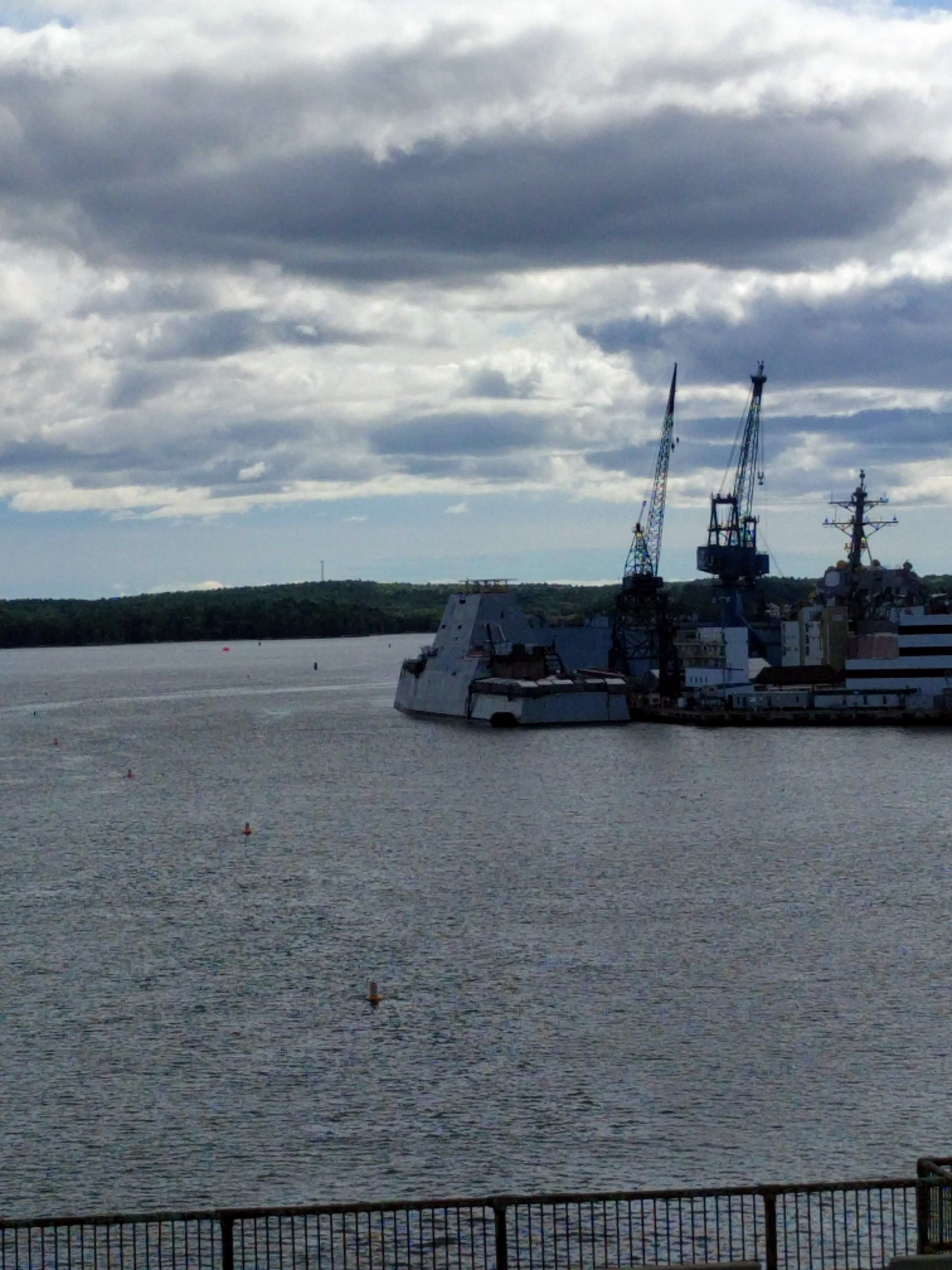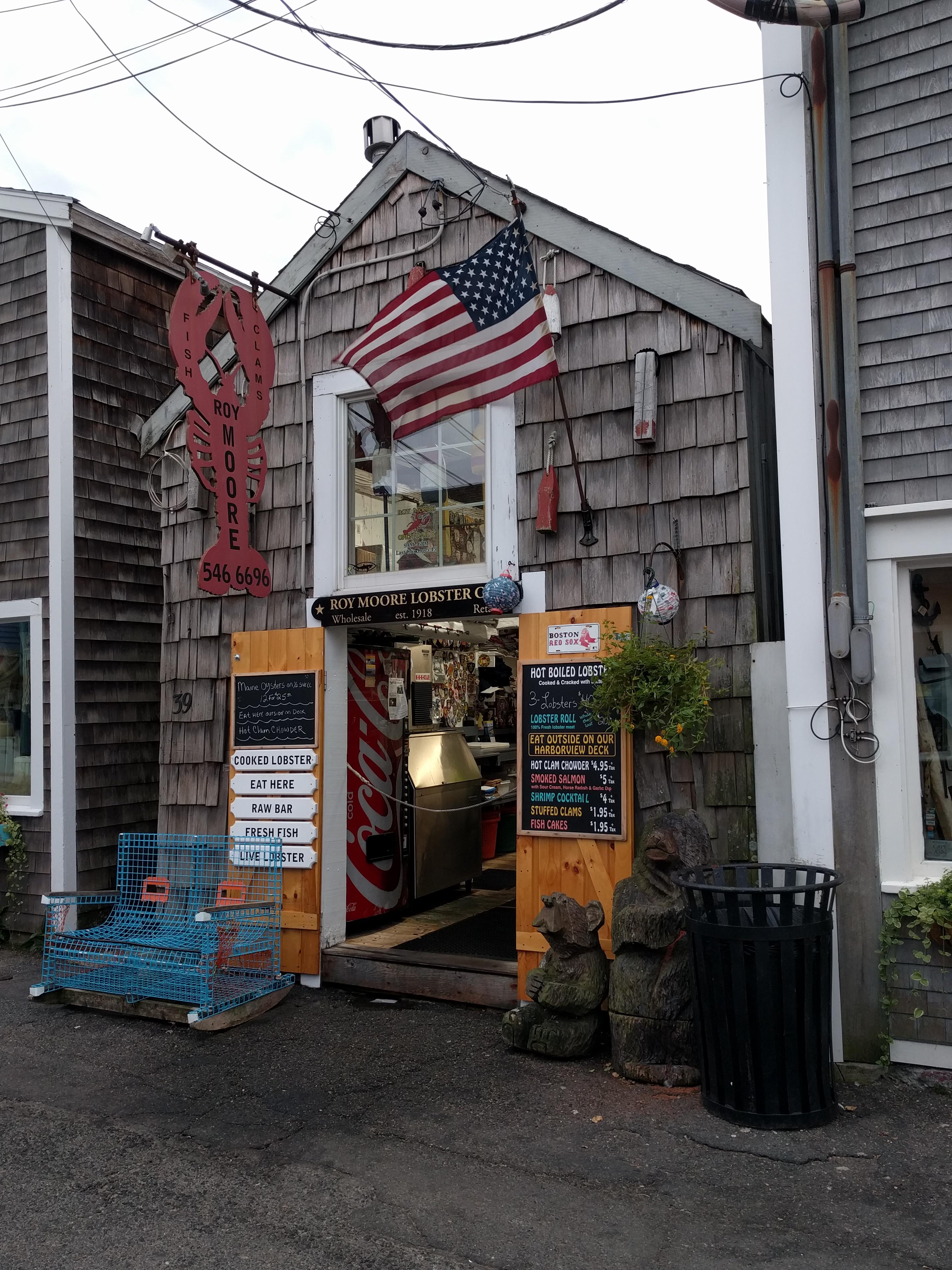 We decided to visit Freeport on the way back, because we were already east of the town. On Thursday, the 12th of September, we set out for Downeast Maine. In Brunswick we stopped for breakfast and met Mike and Krista from Vancouver. We would leapfrog them for the next two days. I took pictures of Bath Iron Works, where many of the best-made American destroyers were built. Strange place to have on a bucket list, but I associated the metal plates on those ships with some of my best tours of duty in the Navy, thanks to the quality of those ships. At Wiscasset we joined Mike and Krista in the long line outside Red’s Eats. This was a highly regarded purveyor of lobster rolls, but I was not impressed.