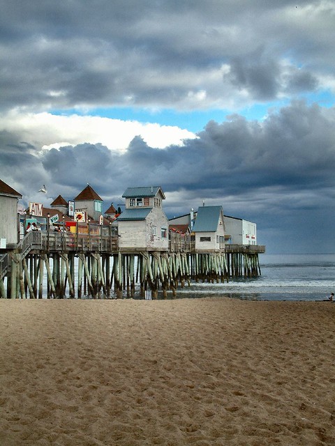 Riding among the “cottages” along the coast of southeast Maine, we paused at Ogunquit, a mecca for summer people and the target of bumper-to-bumper traffic. It seemed that every retiree in the Northeastern US decided to drive to Ogunquit and Kennebunkport on the same day. We stopped for some ice cream, then pushed on. Much of the traffic opted for Route 35 and US 1 in Kennebunkport. We took Route 9, because it followed the coast to the industrial town of Saco and its neighbour, Biddesford. I could not see much, because there were pine woods and homes between the road and the coast. Cheryl pulled ahead while I got stuck by a flagman at a long stretch of paving work. From Saco, she rode Route 5 more directly to Old Orchard Beach. I went the long way on Route 9 all the way around Ferry Point.