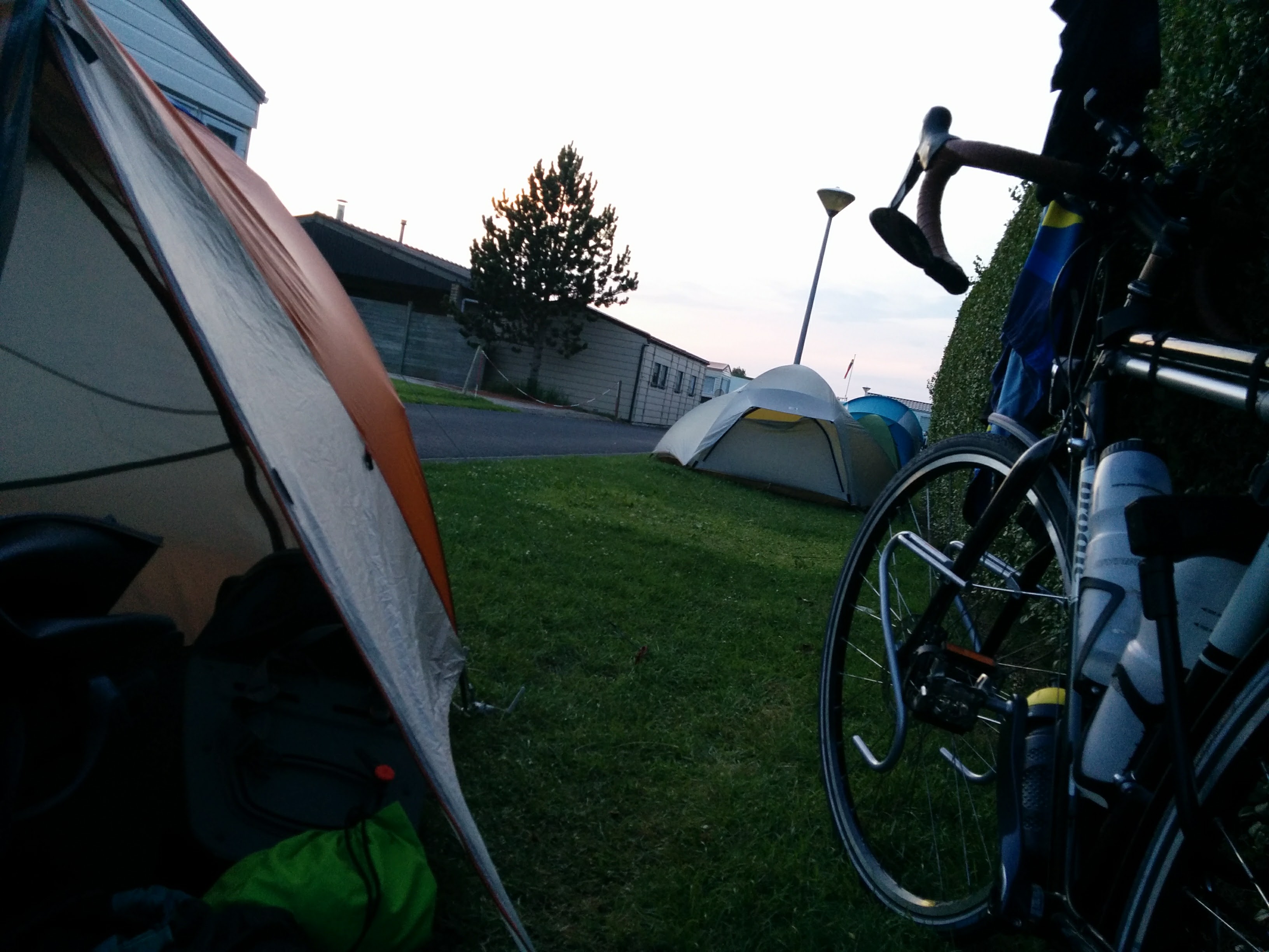 I crossed into Belgium in the late afternoon, and found my way to the border town of Knokke-Heist. A very reasonably priced (EUR 12) campground was hiding behind a French fries joint. Nestled between the river, the massive container port of Bruges, and a highway, I expected it to be noisy, but I was assigned to a pleasant row of tents sheltered by a high hedge, and completely quiet at night. After a shower and with the laundry hanging, I set out my supper at a picnic table, and shared an evening of interesting conversation with a French cycle-tourist named Daniel.