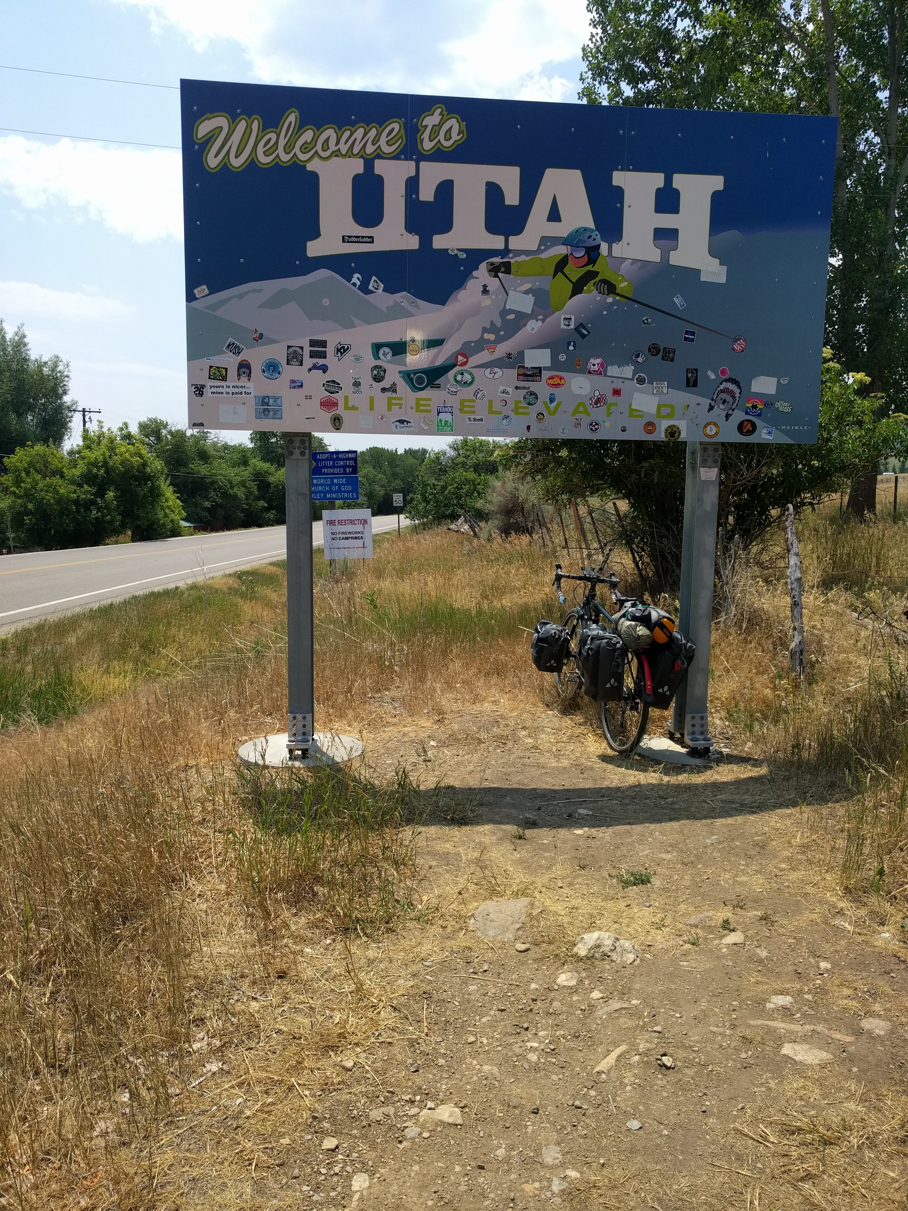 This week had featured beautiful weather, and excellent bike paths between Ogden and Salt Lake City. We rode long and hard, revelling in the lack of motor traffic and the generally excellent asphalt surface under our tyres. The Great Salt Lake shimmered in the heat to our right, but we could not see much of the highways to our left, except when they went over the path.