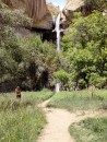 We took US 12 to the Escalante Visitor Center and hiked the lower trail to the Calf Creek Falls, a six-mile round trip. The petroglyphs at station 8 were particularly interesting. The falls themselves looked like a small paradise hidden from the desert above them: trees, springs, and pleasant surroundings.