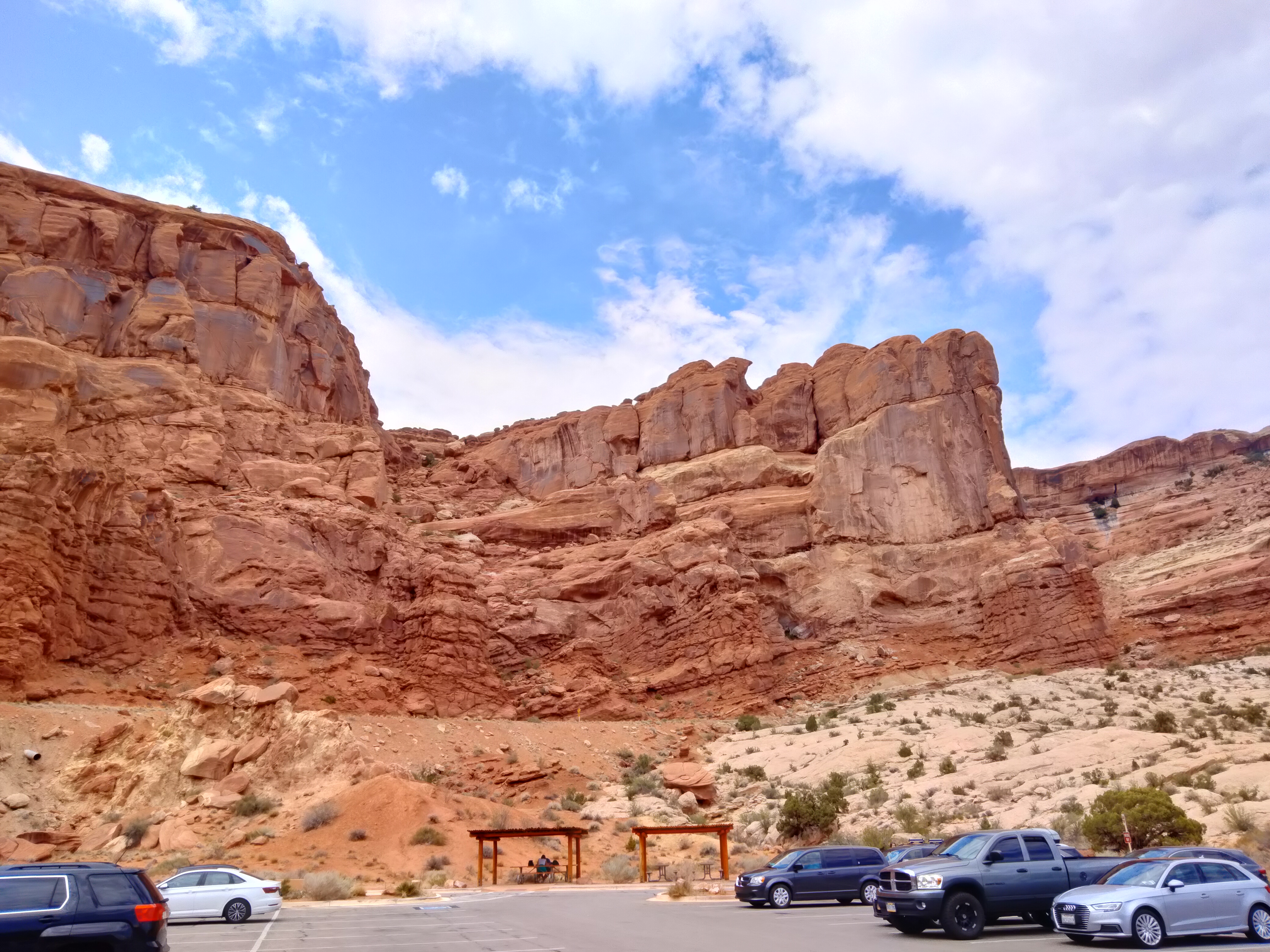 On our way out, I also photographed the Moab Fault where it hangs over the Visitor Center parking lot. This time, I remembered my credencial.
