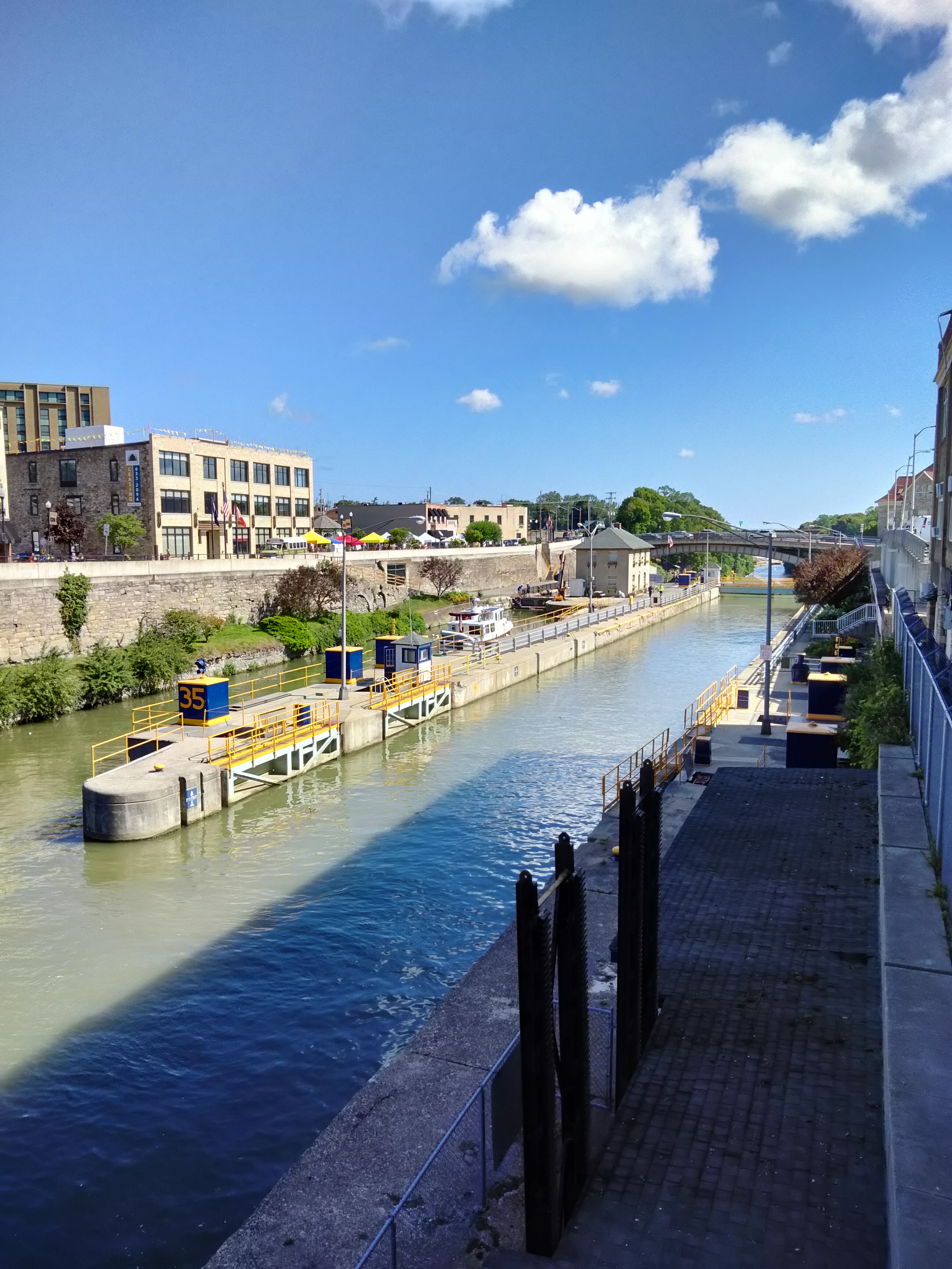he engineering that went into the locks of the Erie Canal amazed me. In Lockport, for example, the Flight of Five Locks carried the water over the Niagara Escarpment, a drop of sixty feet in about two city blocks. Originally built in 1824, the locks have been restored and now carry traffic up and down the cliffs that, not far away, run under Niagara Falls.