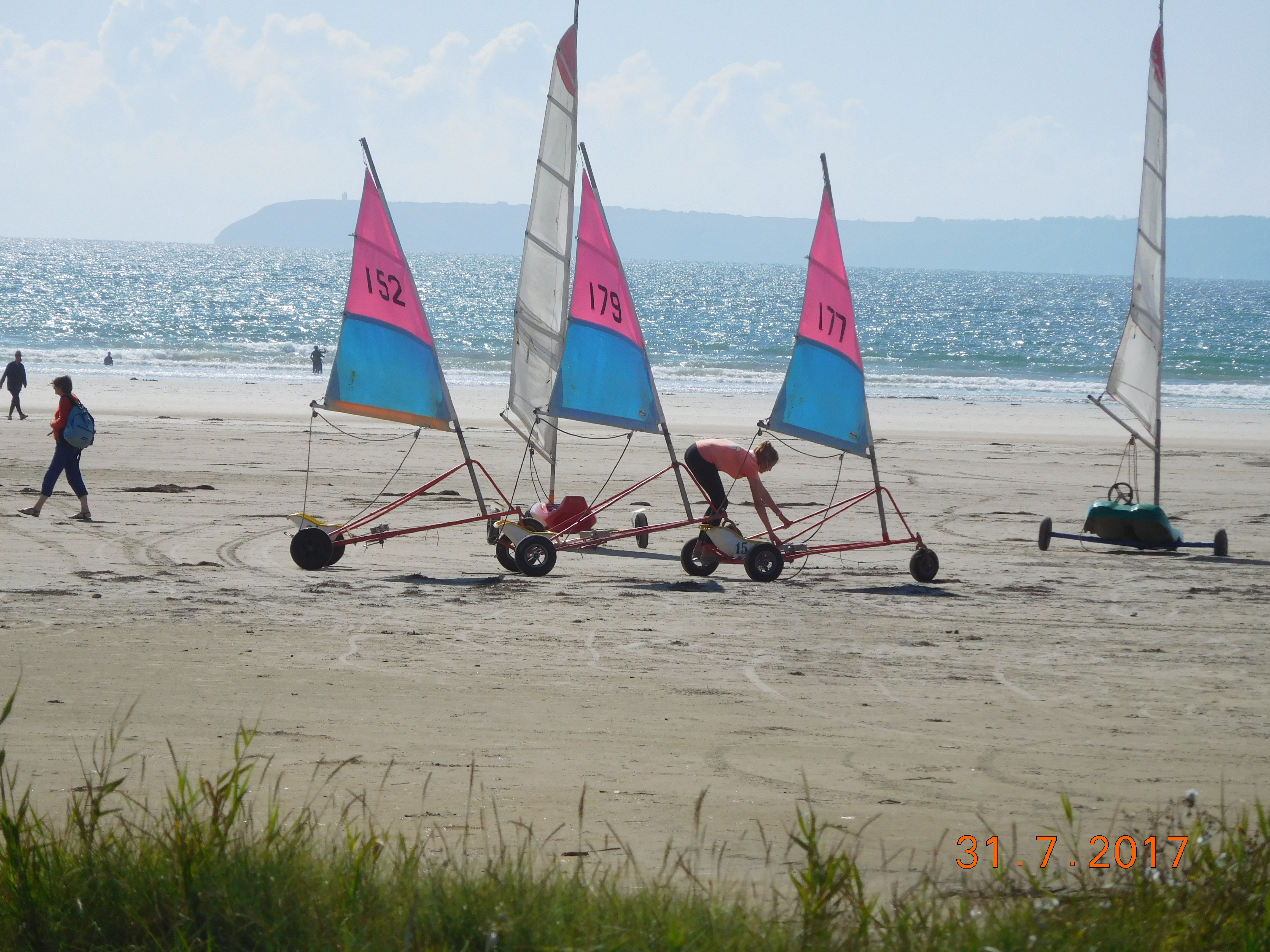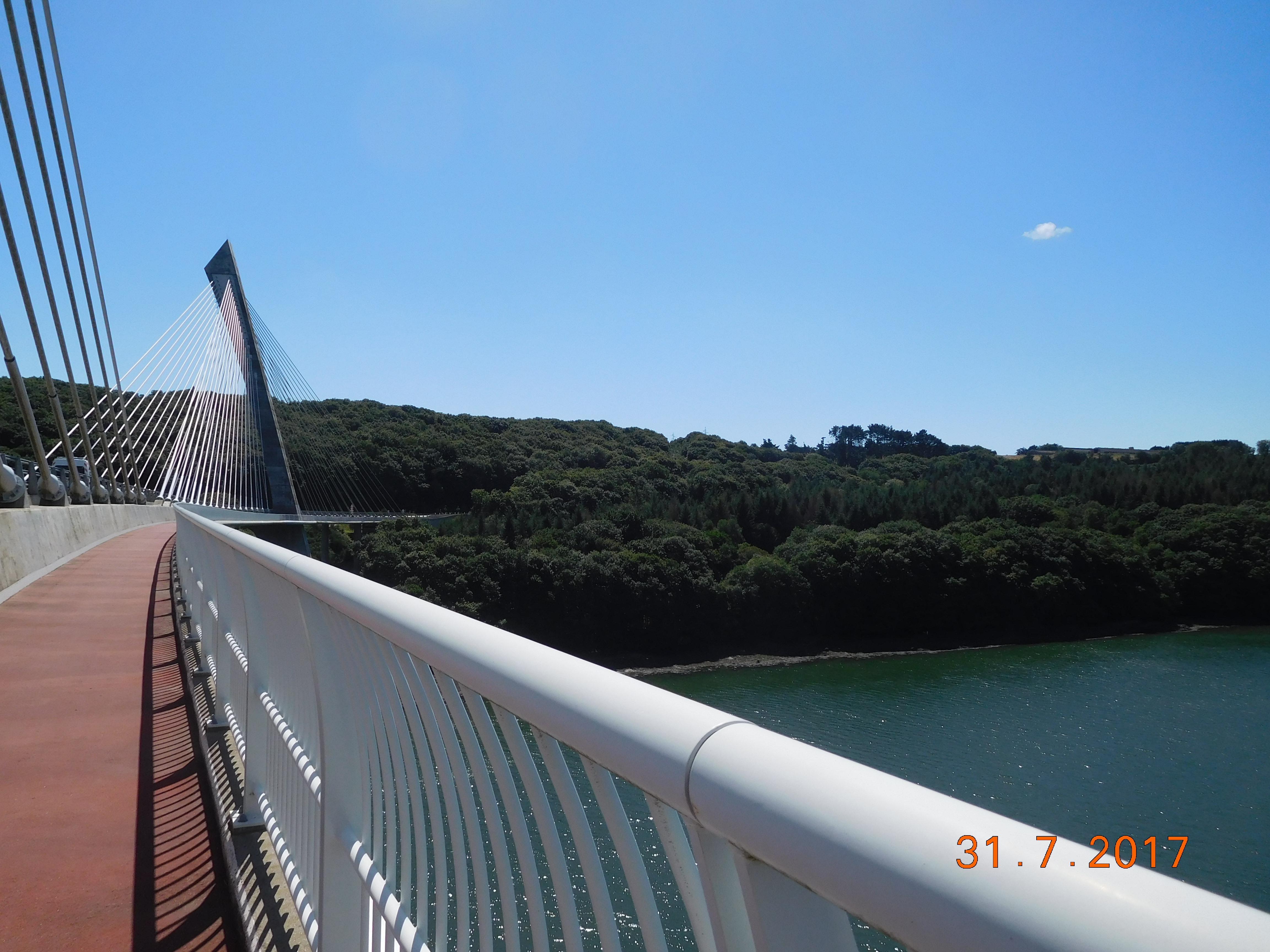 The bike-friendly bridge over the wide mouth of the Élorn River was a marvel of modern architecture, affording a view of the well-protected harbour. Eurovelo 1 took me over fields and occasionally by beaches. On one pass by the water, I stopped to enjoy the sailing bikes racing on the beach.