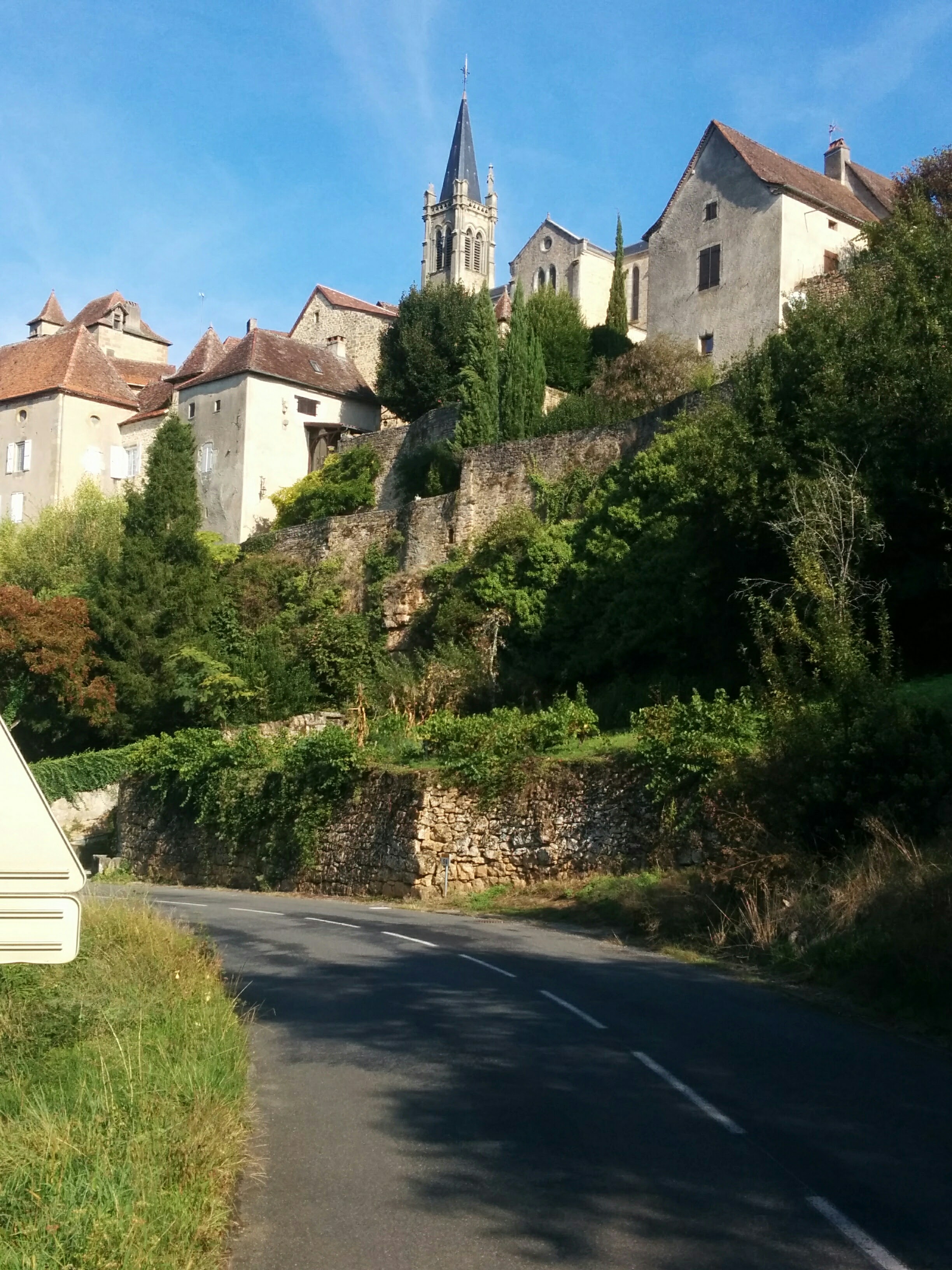 There, we crossed of the Dordogne River for the last time. Cheryl wanted me to see the cliff town of Rocamadour. Shortly after crossing the river, we asked some men working on a house renovation project about the best way to get there. They told us that what looked like the easy way to the main highway at Montvalent was actually rough and steep. We decided to take the D-15, which looked like a long, steep climb, but which turned out to be relatively gradual and quite tolerable.