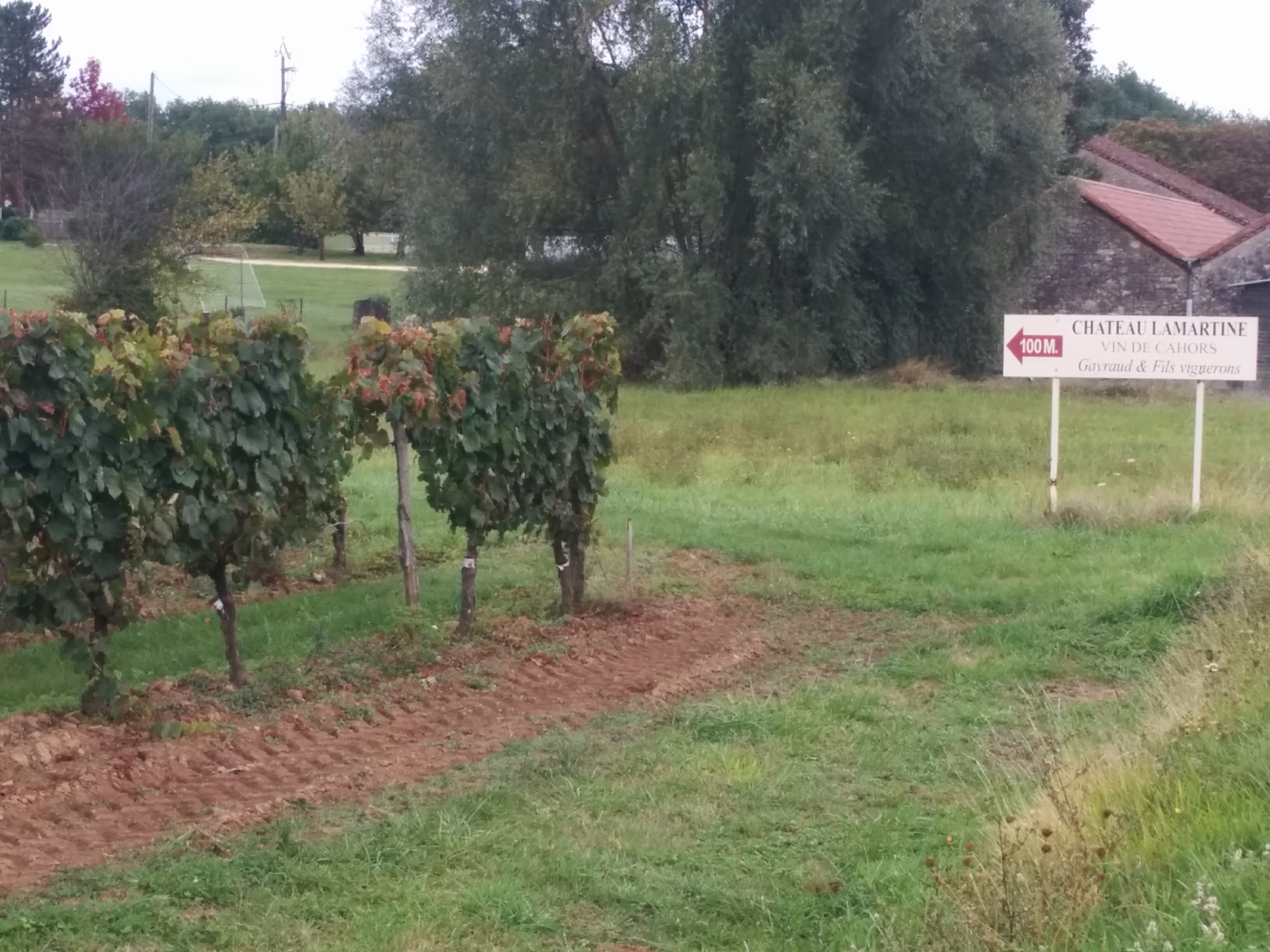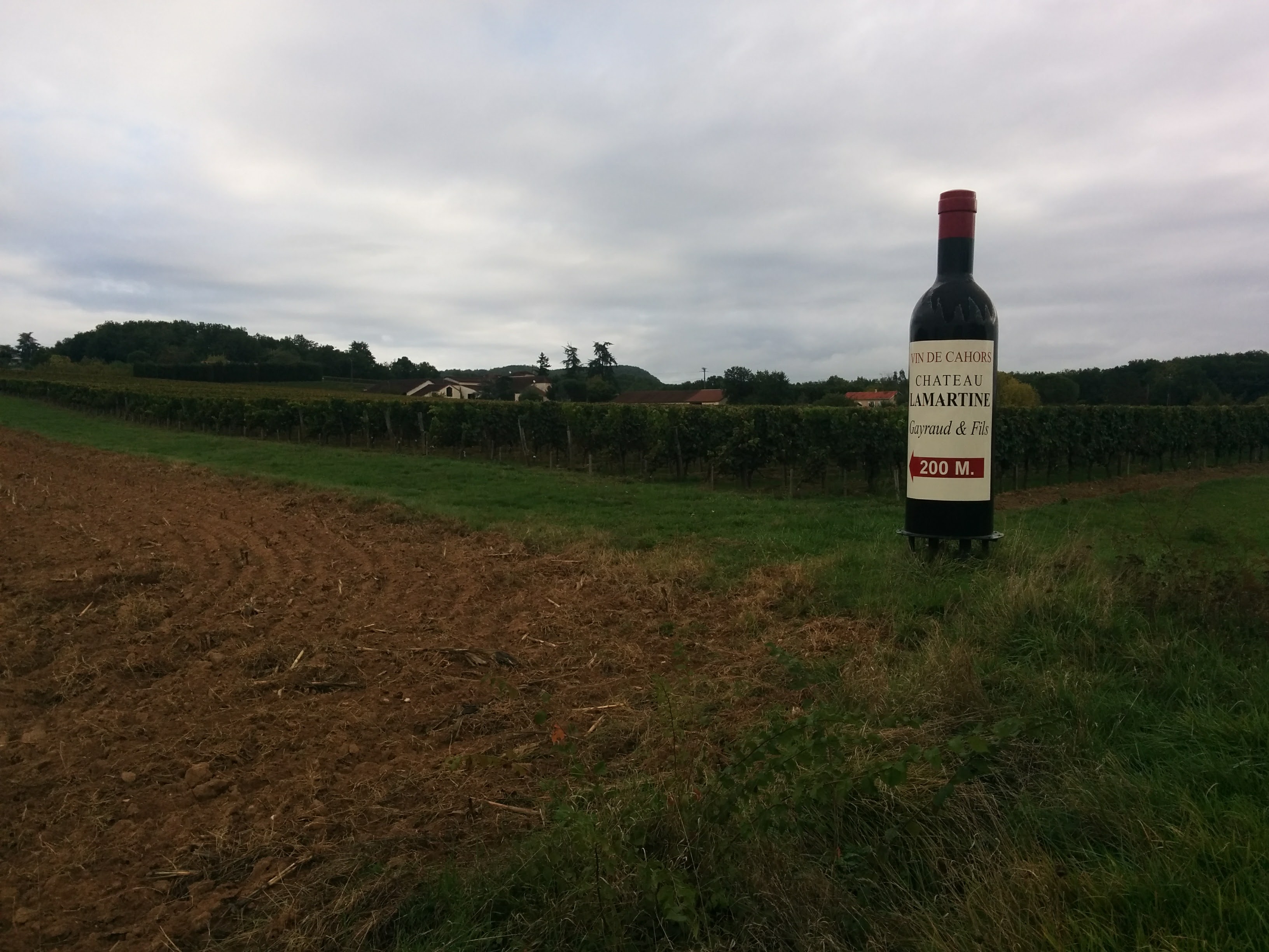 The next day we only rode 19 km, to the train station at Monsempron, finishing our ride down the valley of the Lot. As the clouds gathered, we passed vineyards of the black Malbec wine that made Cahors famous, including La Martine, a wine that we had enjoyed in Cahors itself.