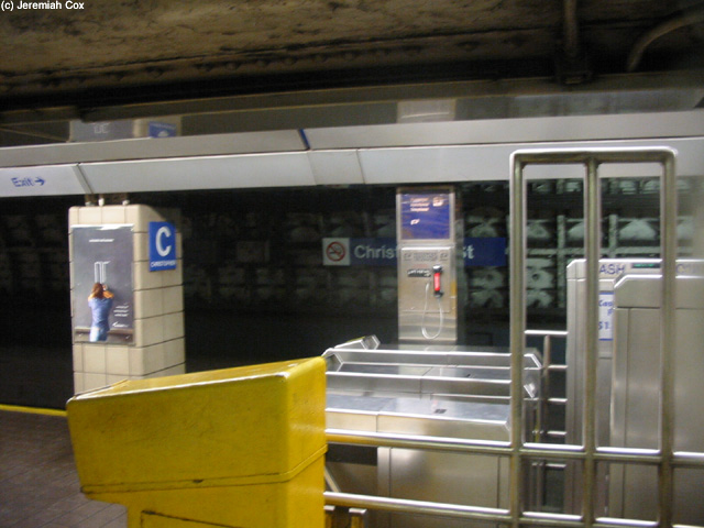 Surrounded by other riders, I debarked at Christopher station as instructed, to find that “not accessible” also meant that the exit turnstiles did not have a large one on the end. The others easily lifted their bicycles over the turnstiles, but I waited for everyone else to exit before attempting to hoist my twenty-kilo steed above my shoulders. I made it, but only barely. Next time, I will take the train all the way to the next “accessible” station and ride back!
