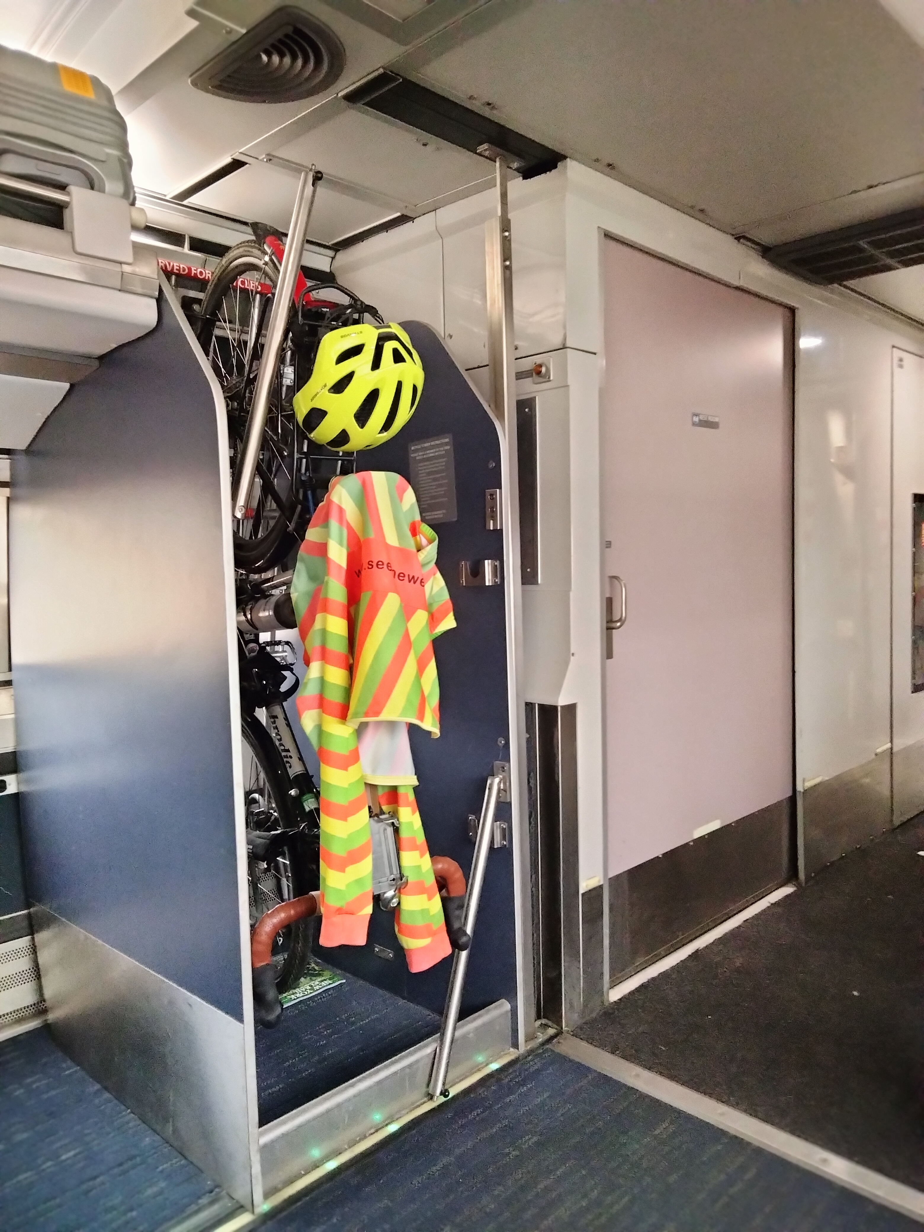 Just before nine in the morning, the Amtrak conductor helped me lift my bike into the coach. The bike fit easily on the hooks at the end of the car, but hanging my helmet and jersey on the bike helped passengers avoid it without surprises.