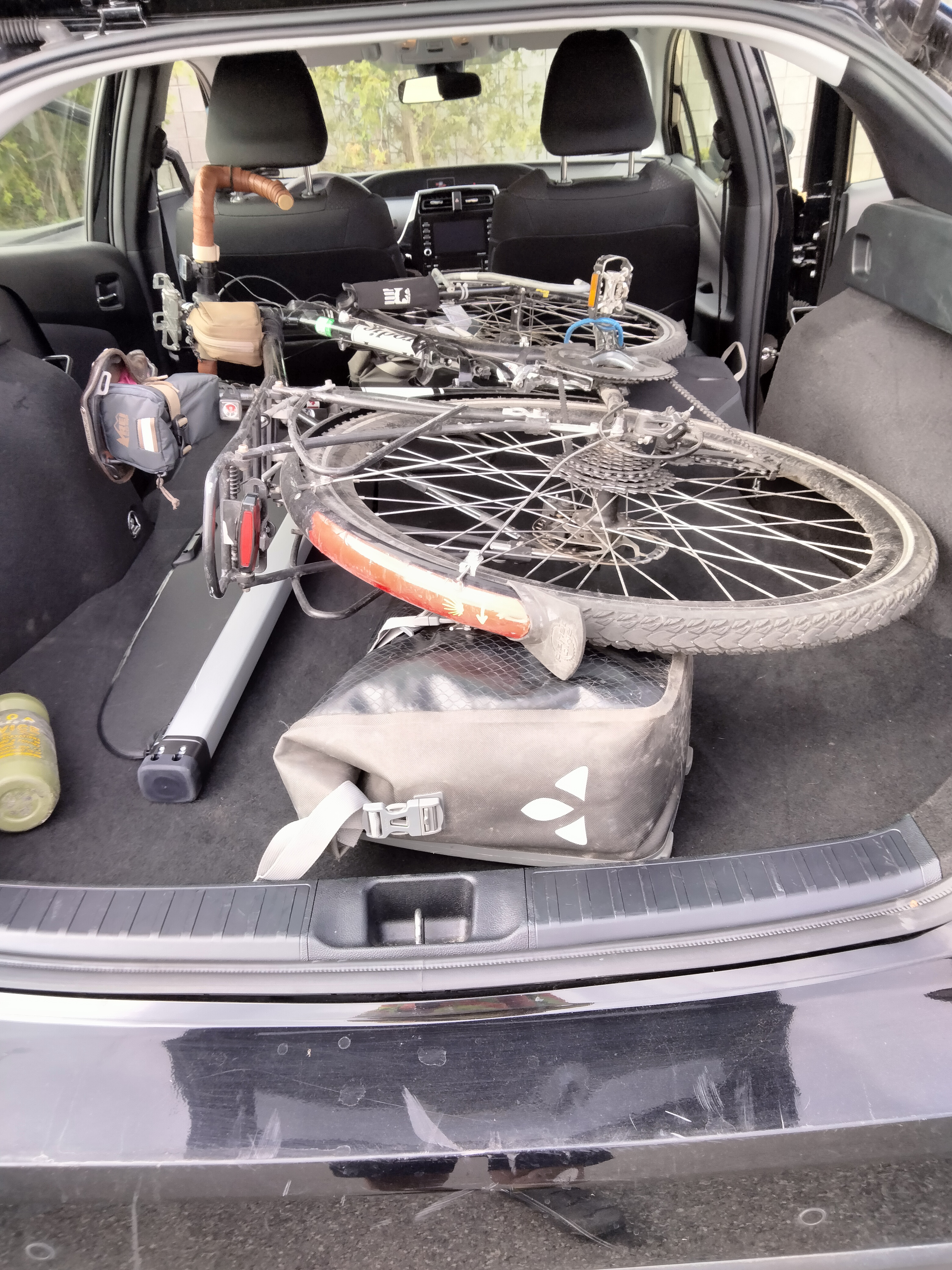 Sunday, I booked a rental car to return to Norfolk. Monday morning, I picked up a Toyota Prius at the Flint airport and drove non-stop to Norfolk with my bicycle and bags in the car. It was my first experience driving a hybrid, and I was surprised by many things. The car got 61 miles per gallon until I started over the Alleghenies in West Virginia, then the mileage dropped to “only” 54 mpg. The car easily swallowed my whole bicycle with room left over. The Bluetooth display system played the streaming music from my phone.
